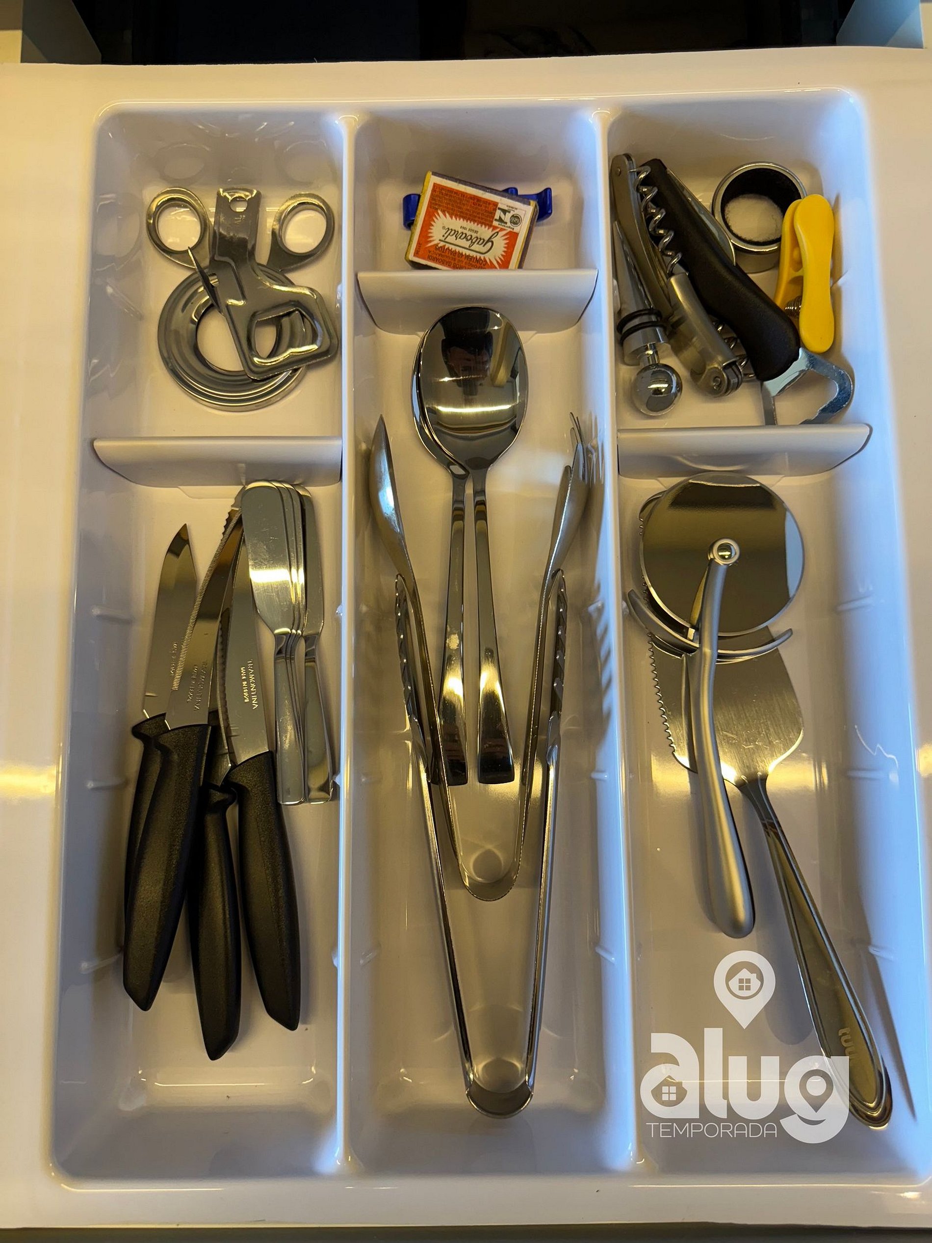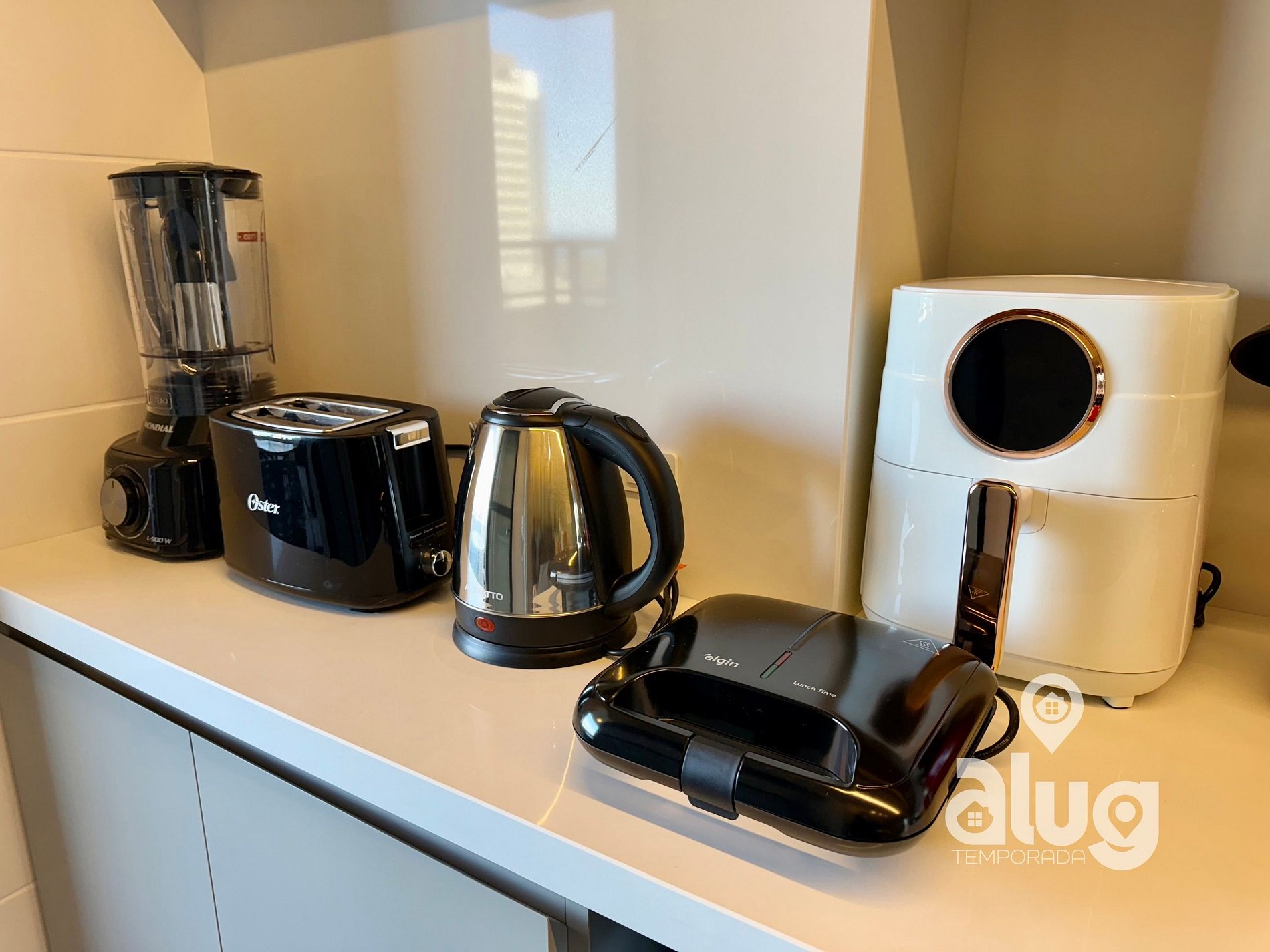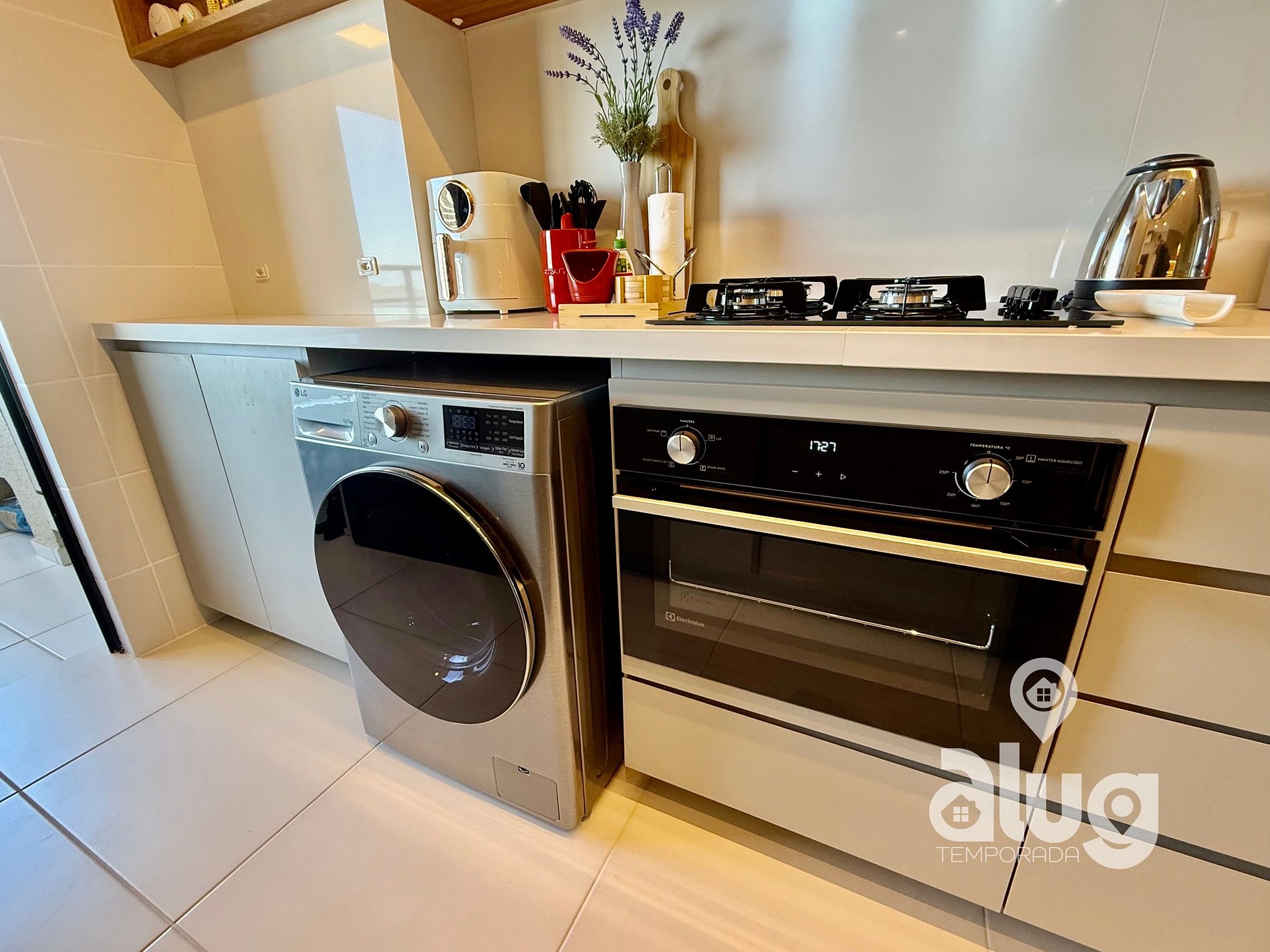 • Cozinha completa equipada com utensílios, forno, cooktop, geladeira, micro-ondas, lava-louças e até máquina lava e seca;