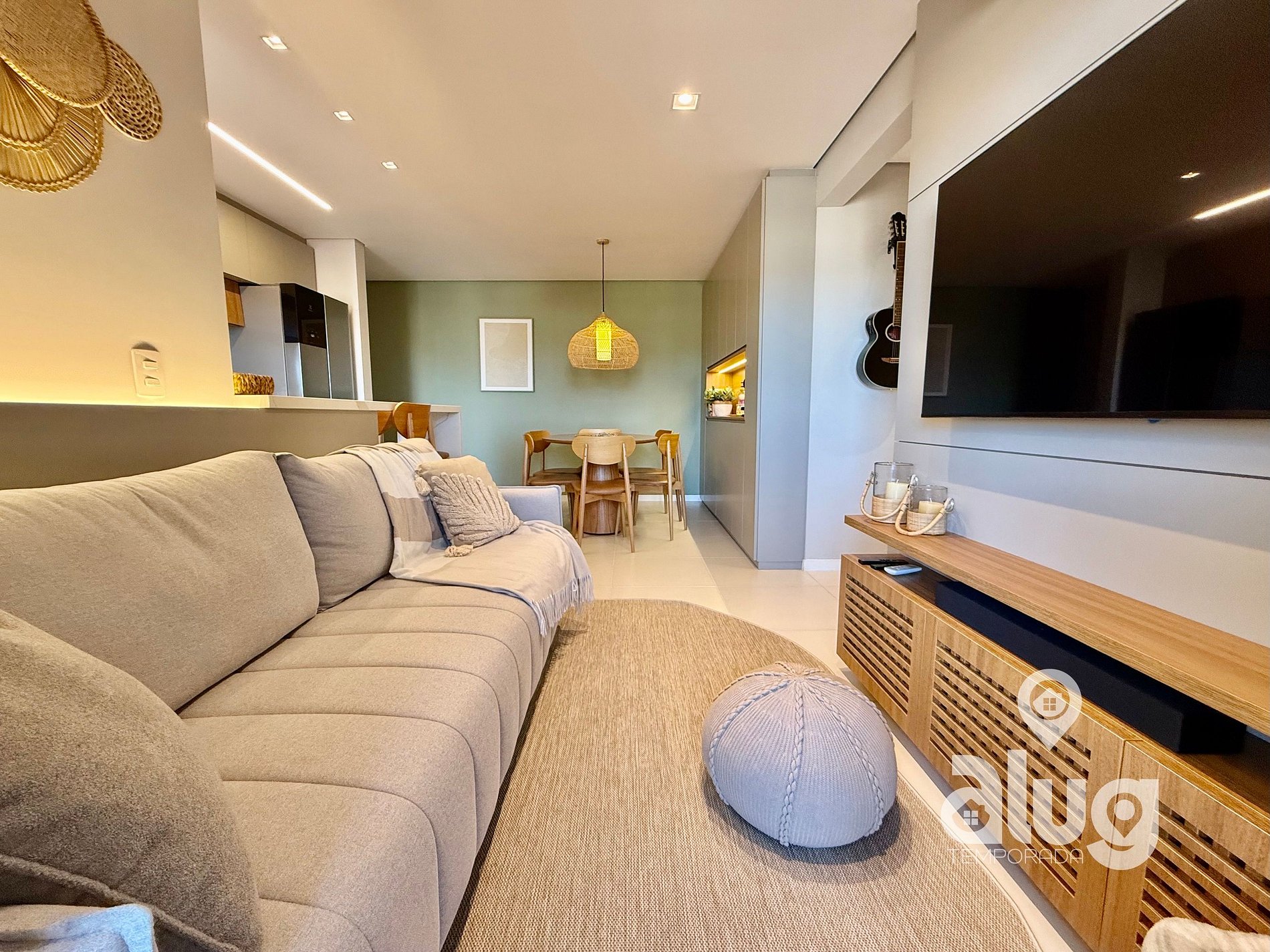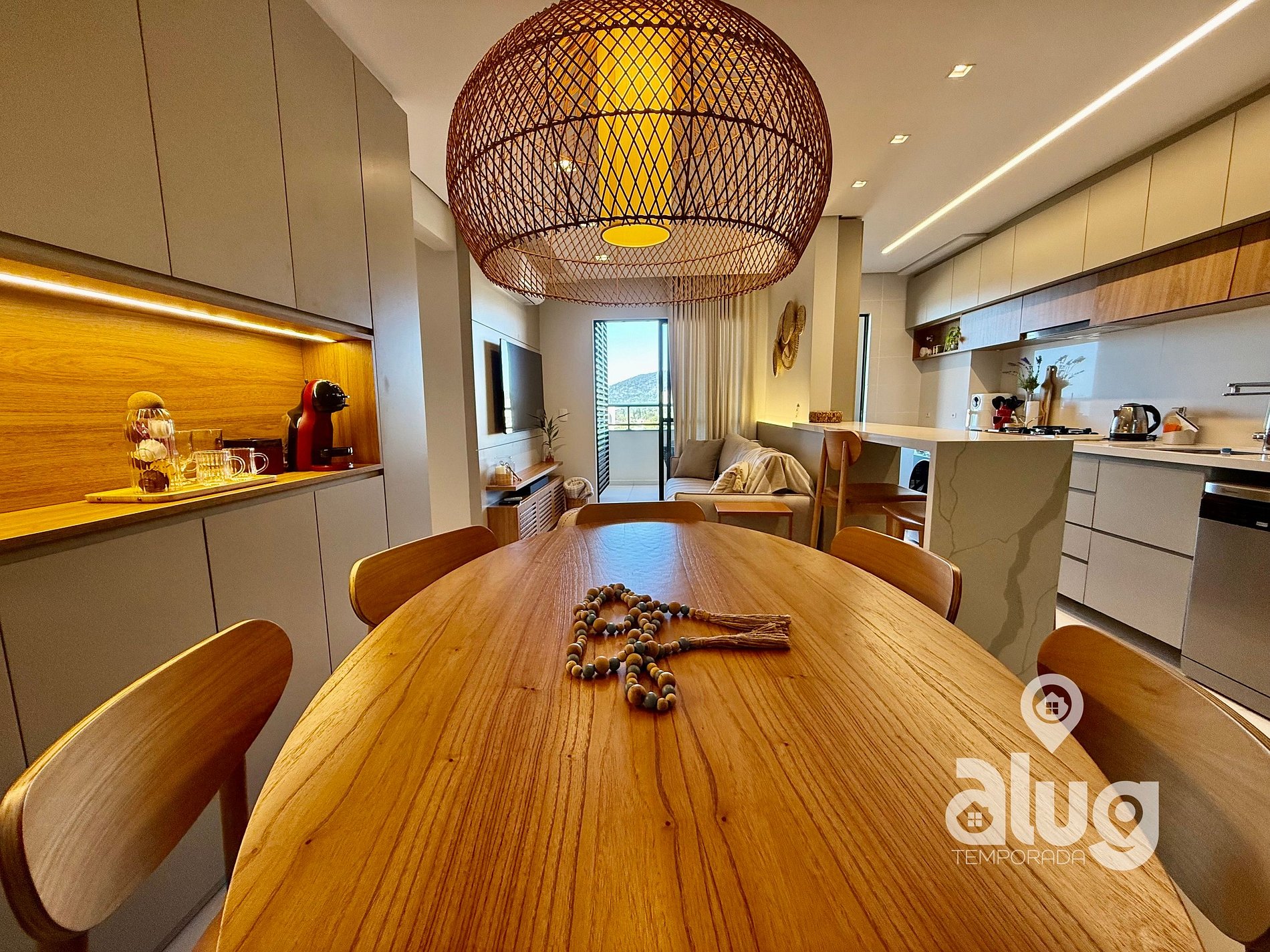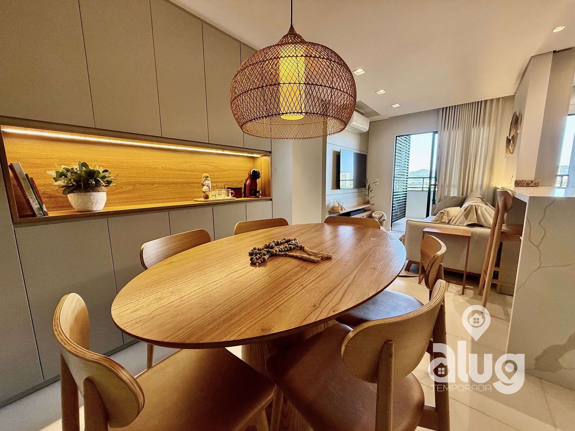• Sala de estar e sala de jantar integradas, decoradas e climatizadas;