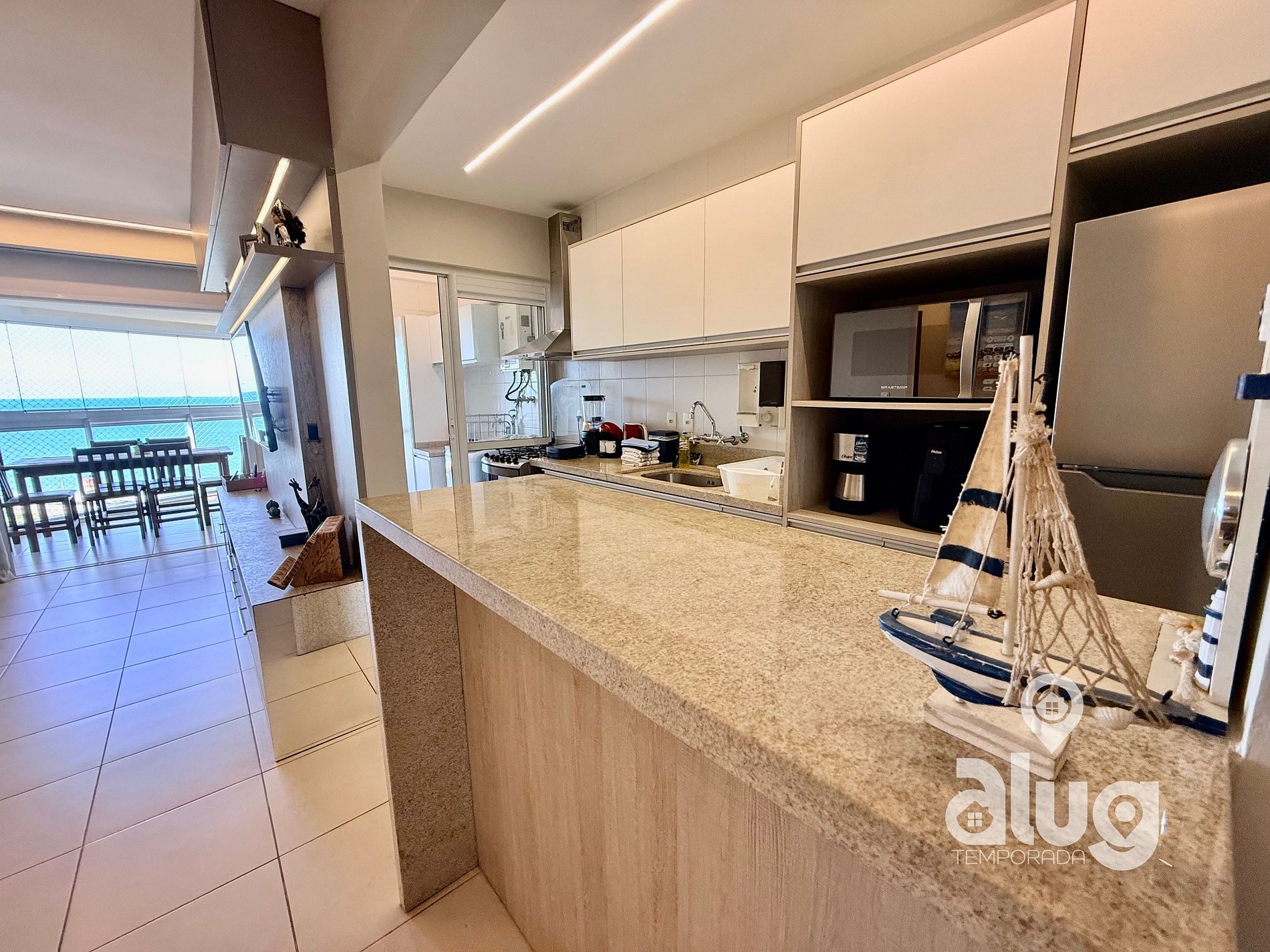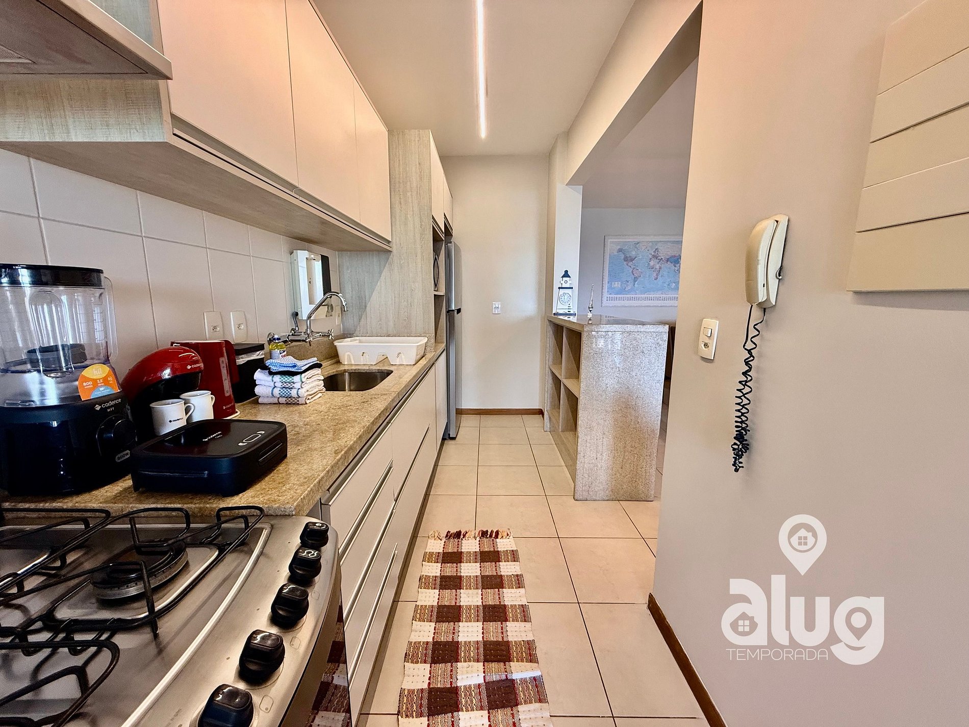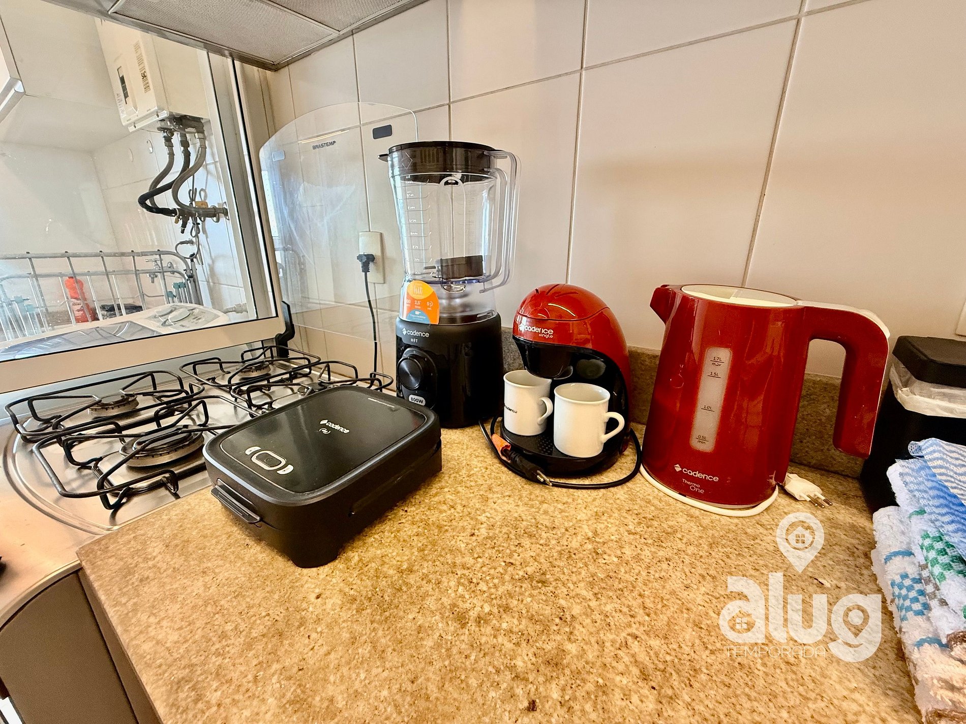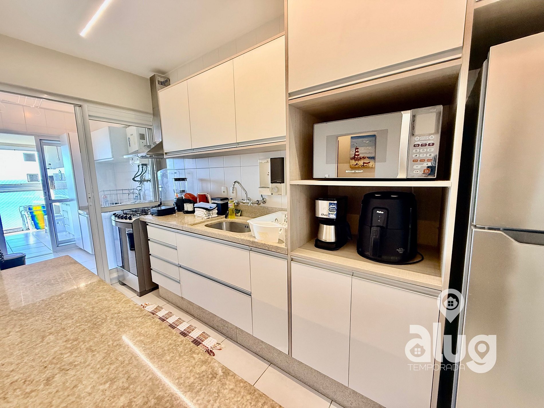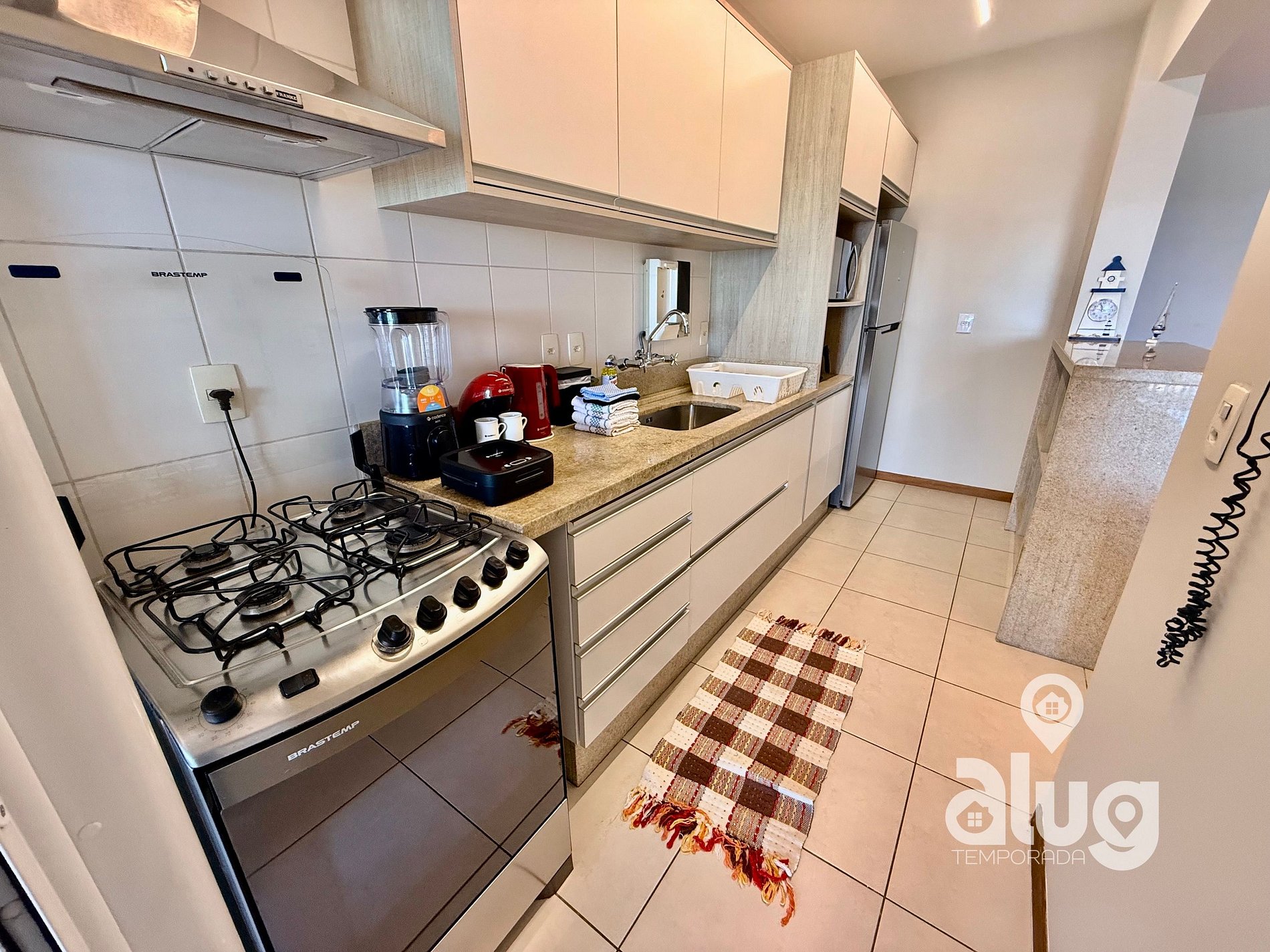 - Cozinha completa com utensílios, geladeira, fogão e pequenos eletros.