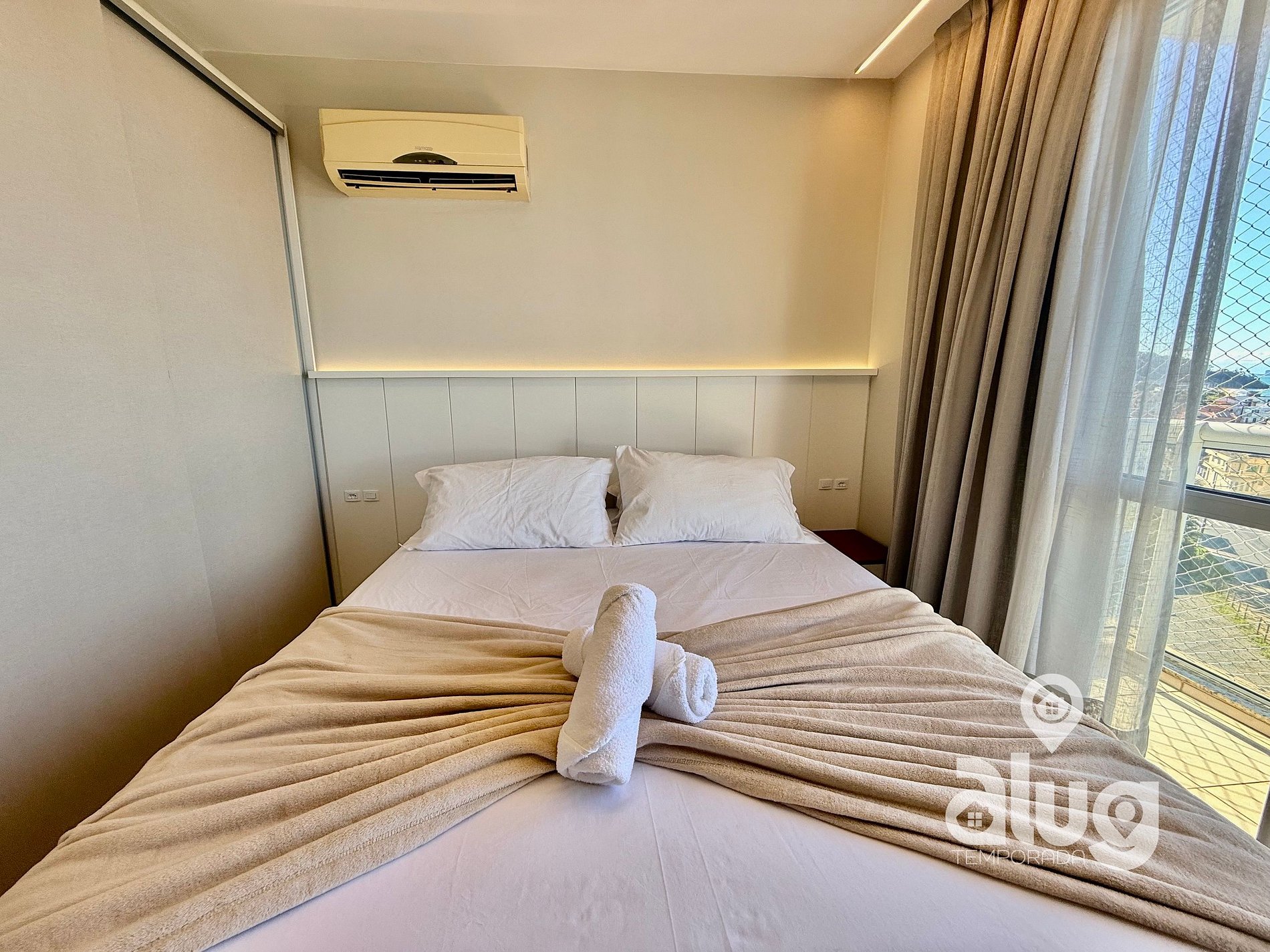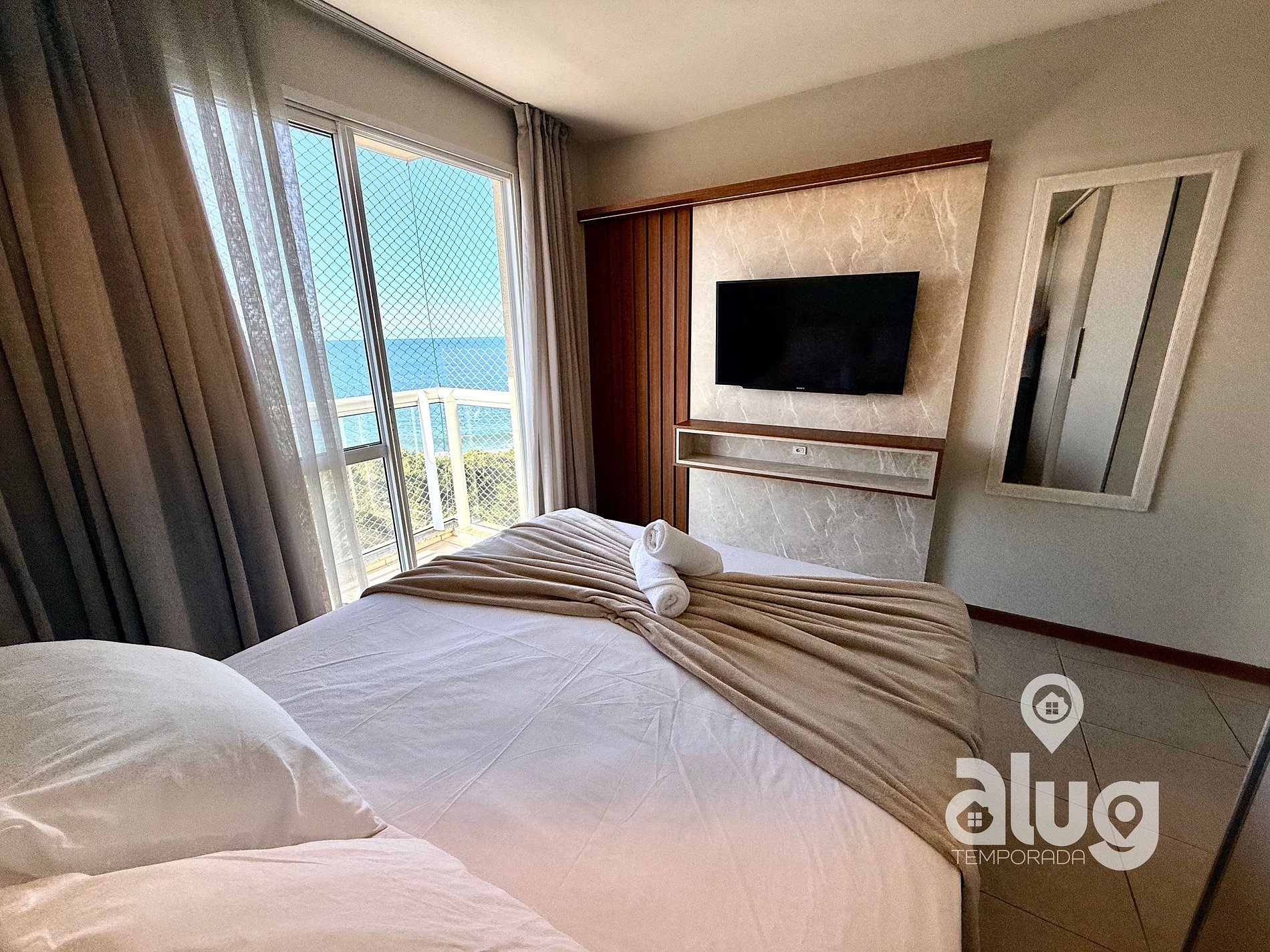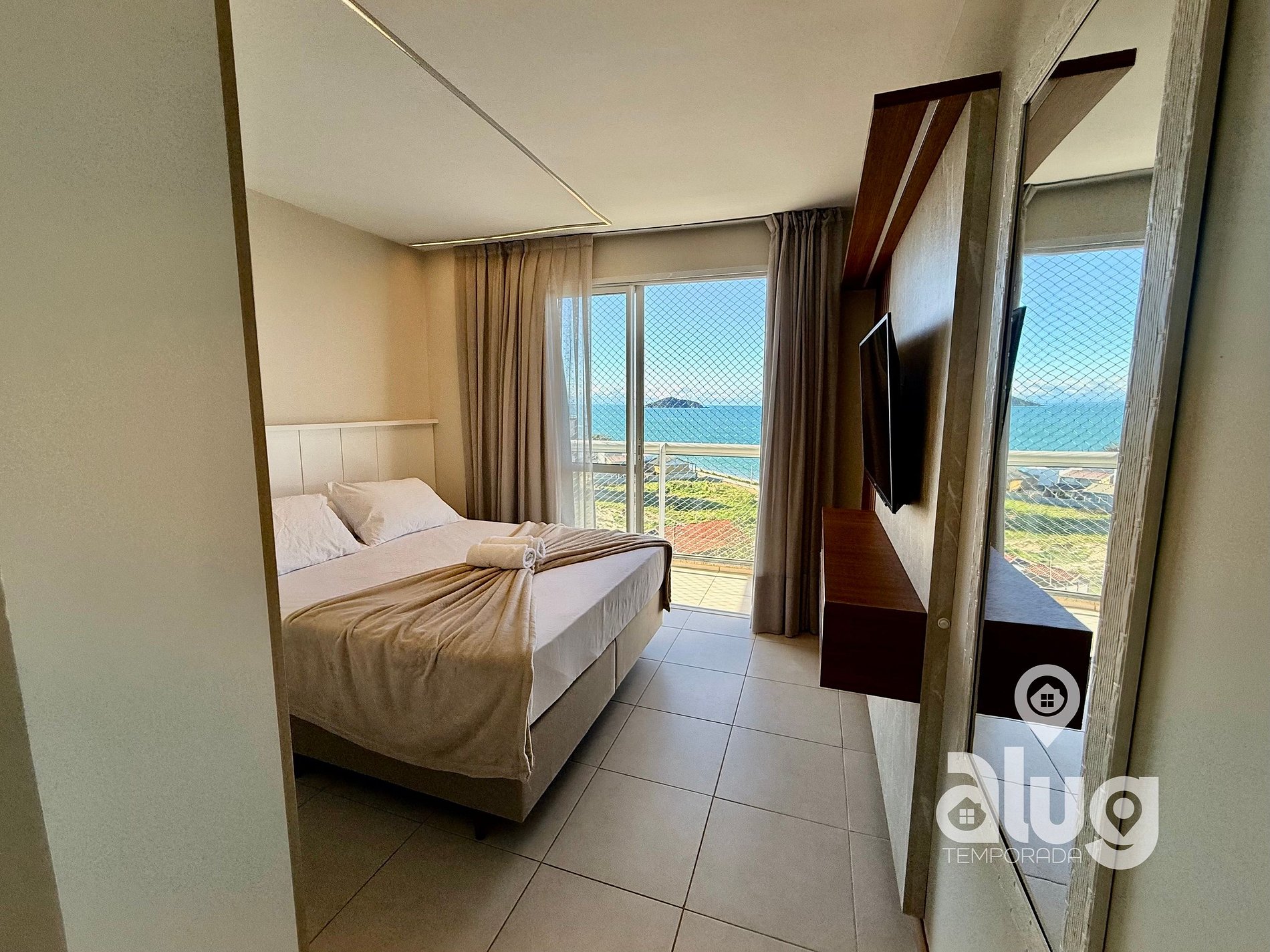 1.Suíte Master: : 1 Cama queen size, Smart TV, Ar condicionado e sacada com vista p/ o mar2
