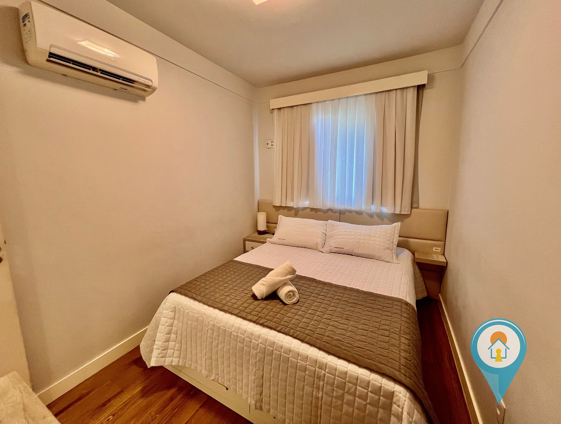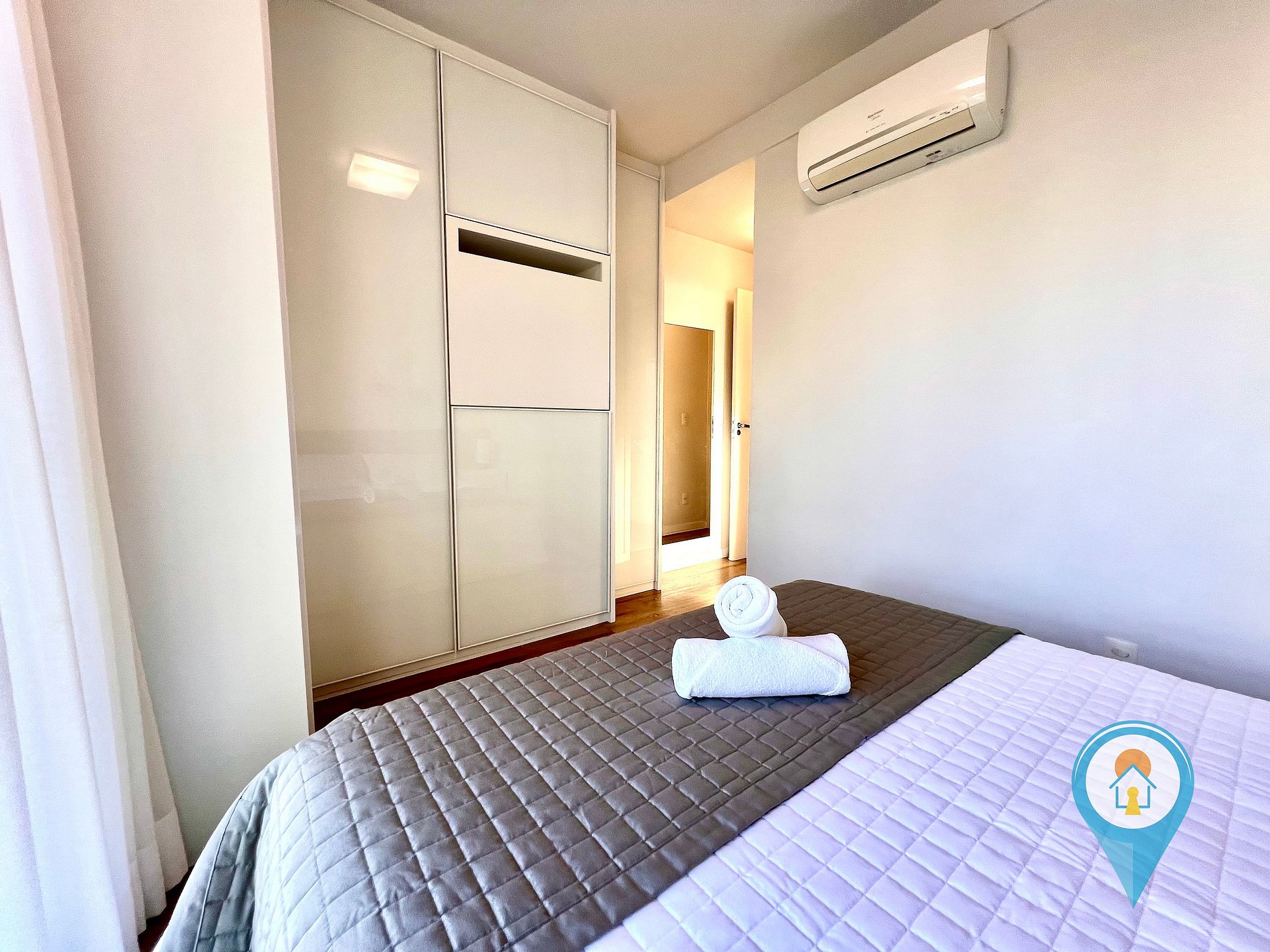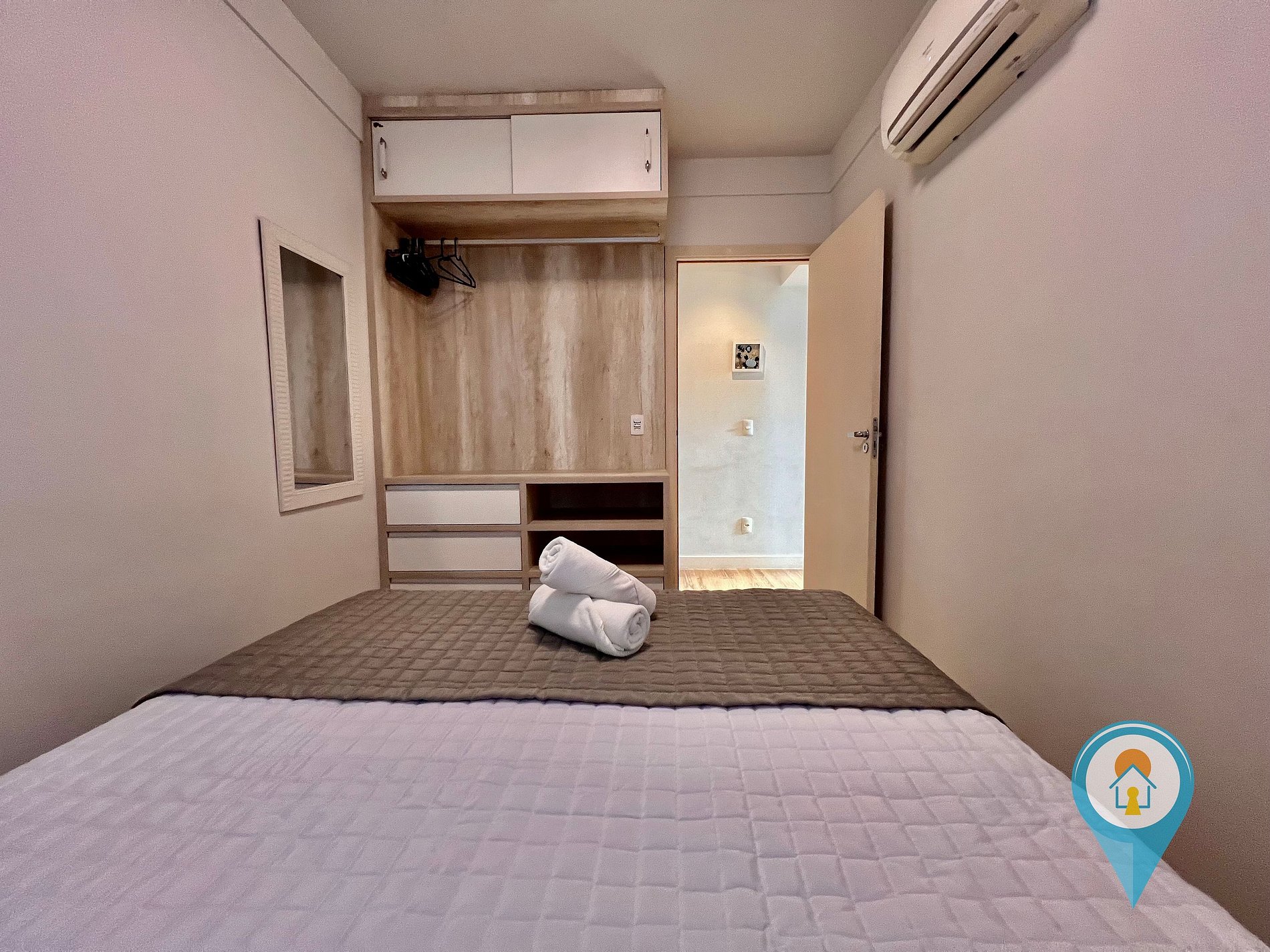 Quarto Casal 1: Equipado com Ar condicionado, Cama de Casal e móveis planejados + 1 colchão de solteiro extra.
