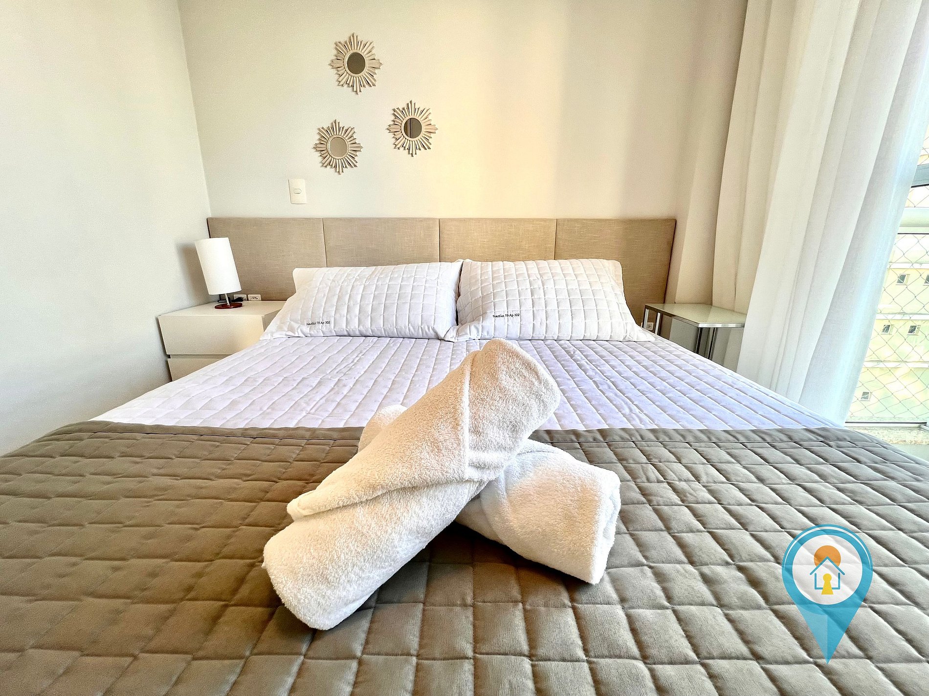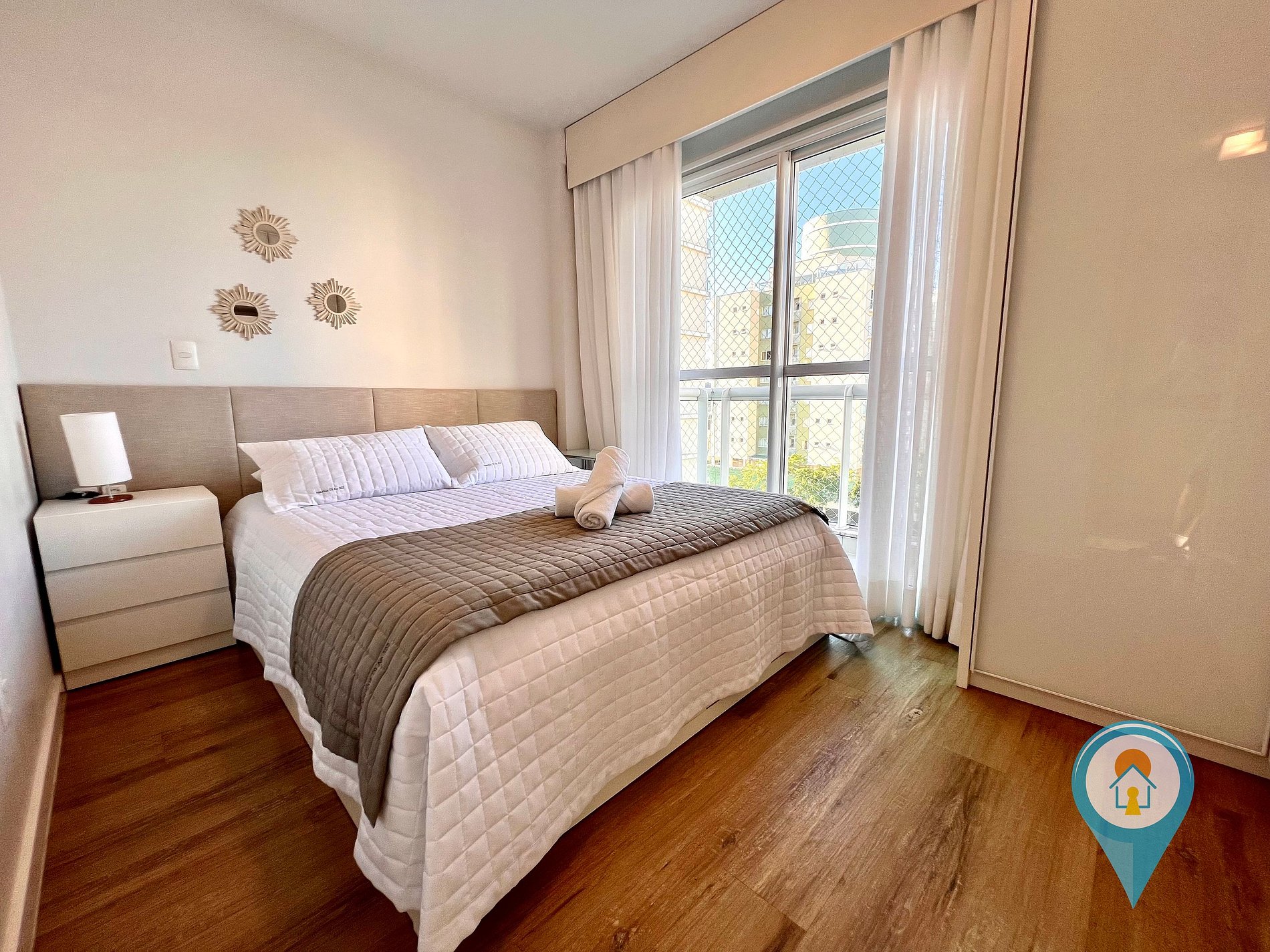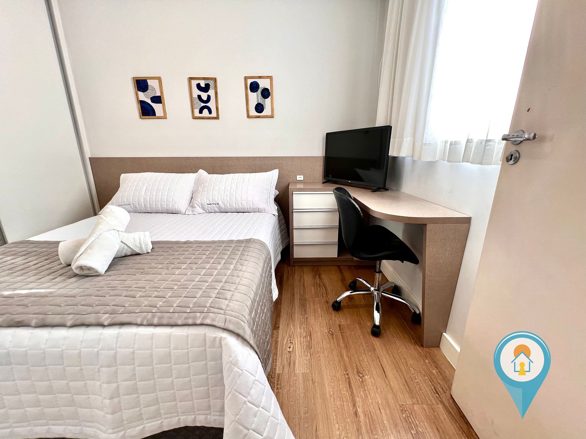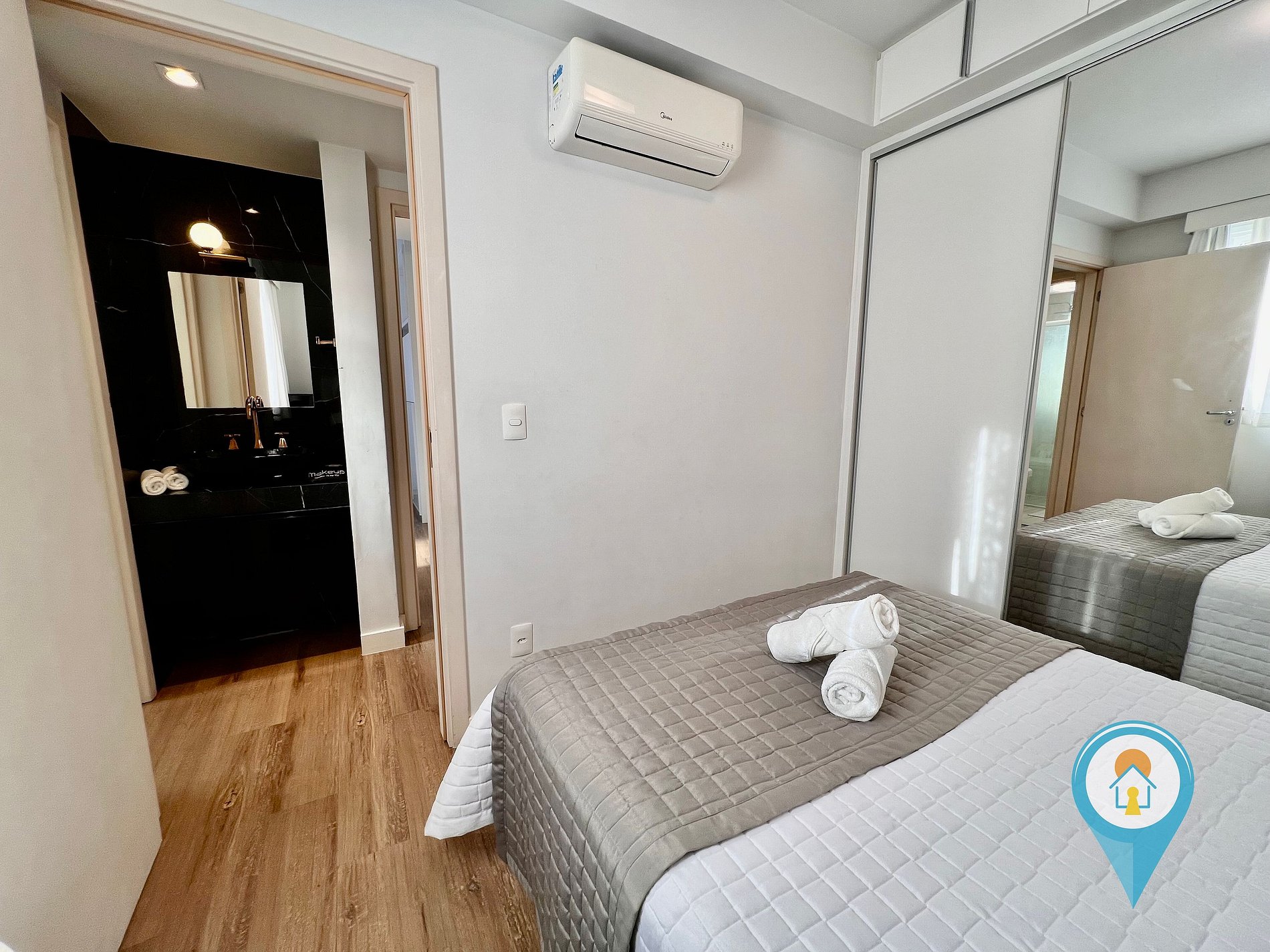 Quarto Casal 1: Equipado com Ar condicionado, Cama de Casal e móveis planejados + 1 colchão de solteiro extra.