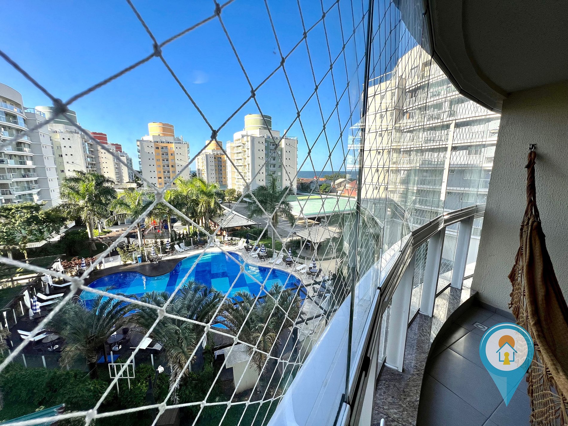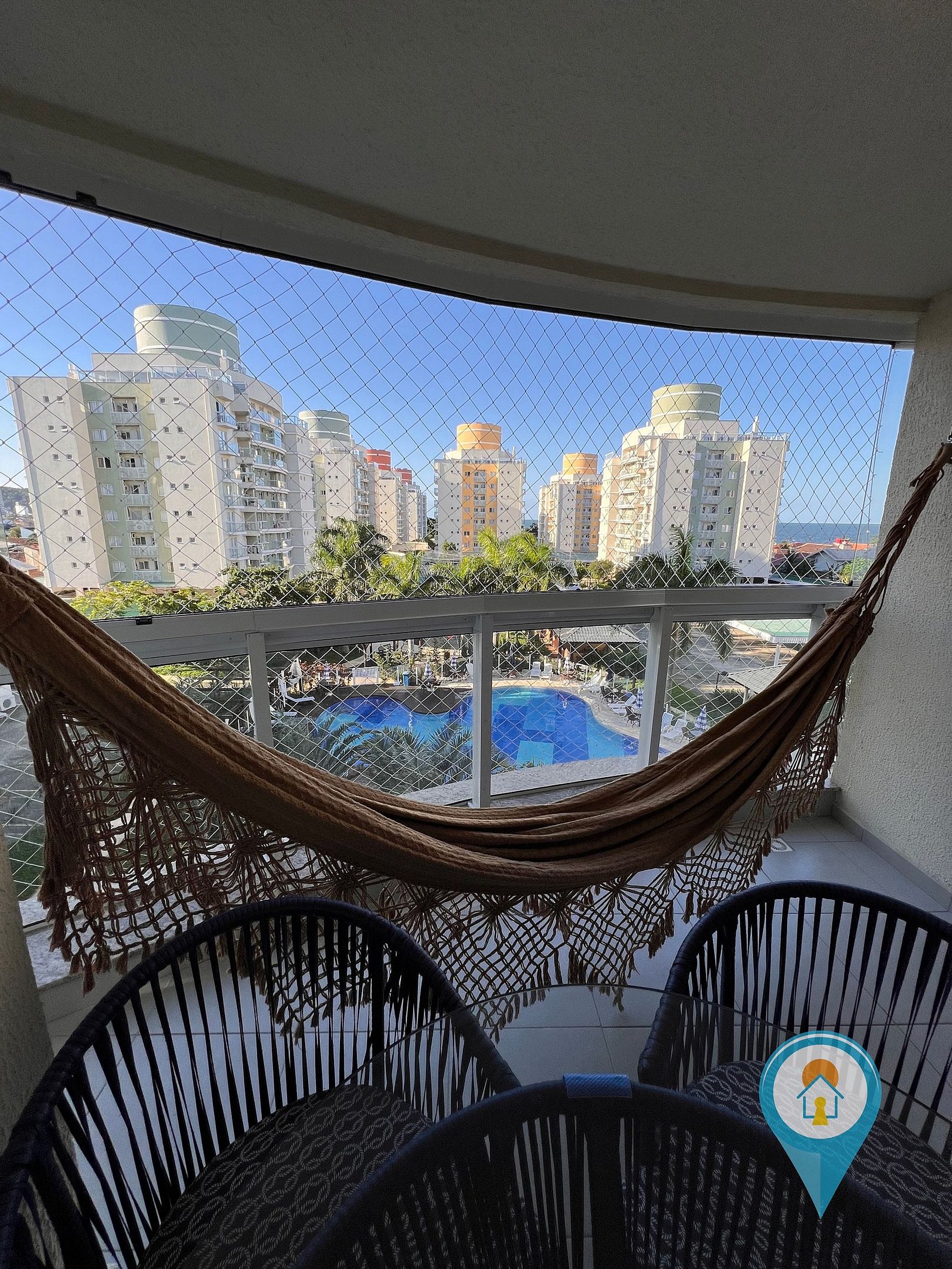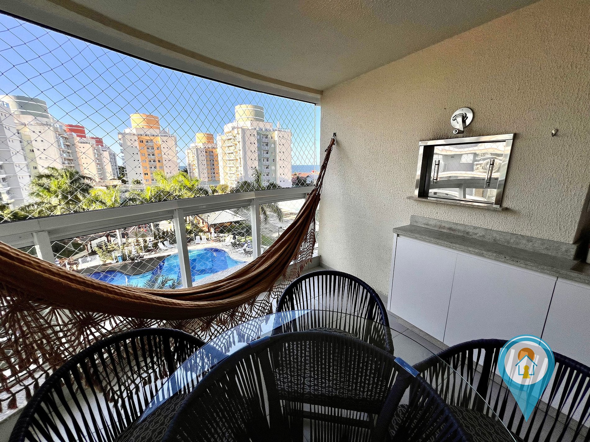 Na sala temos Ar condicionado, SmartTV 50”, BTV, Confortável Sofá e mesa de jantar. Saindo da sala você tem acesso a uma excelente sacada com vista para piscina, churrasqueira e tela de proteção para segurança das crianças.