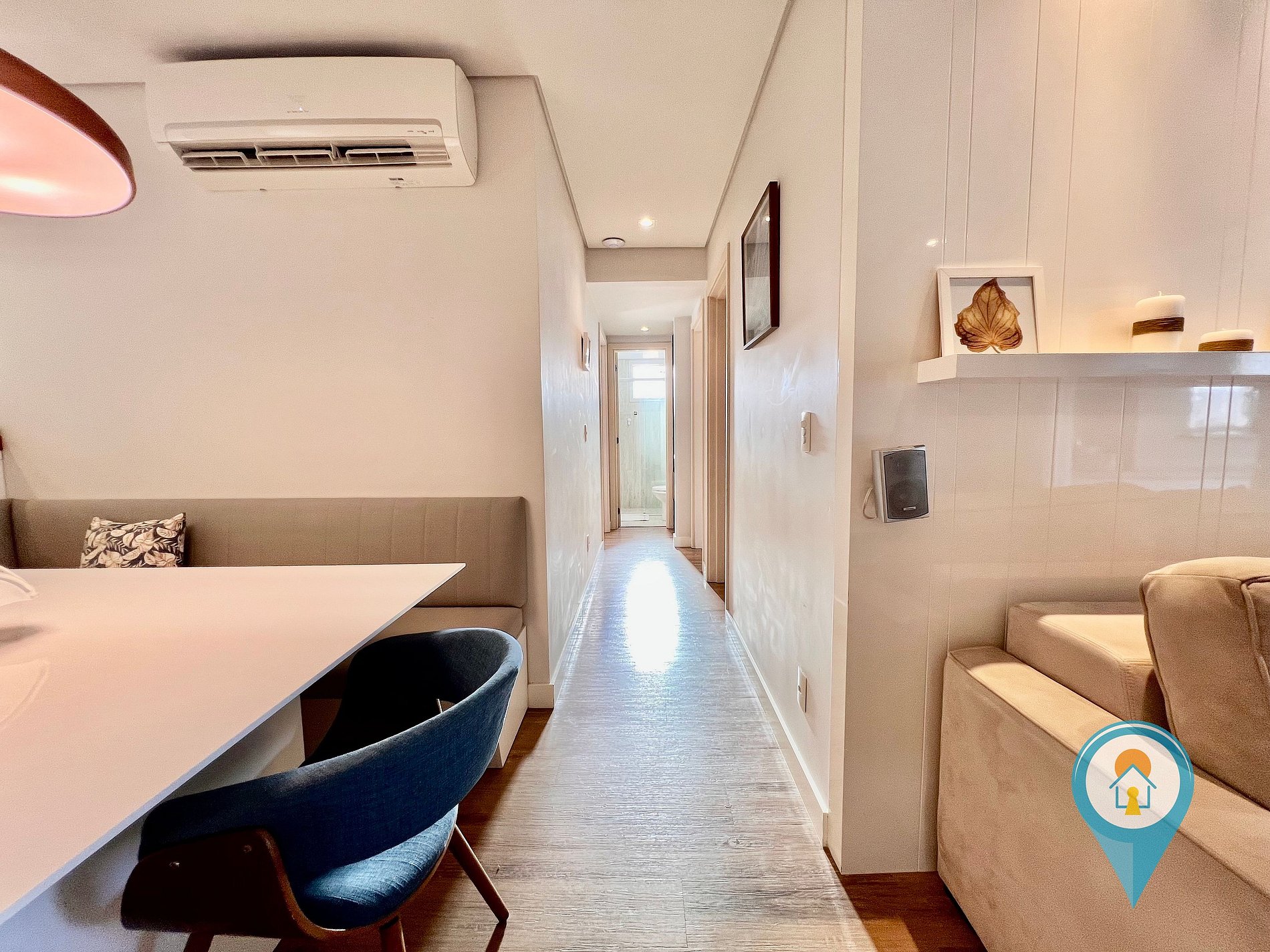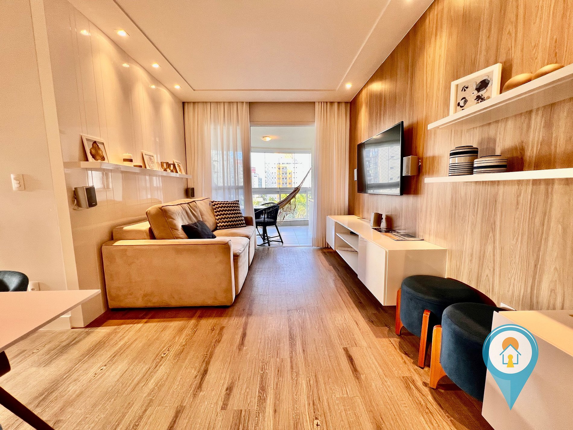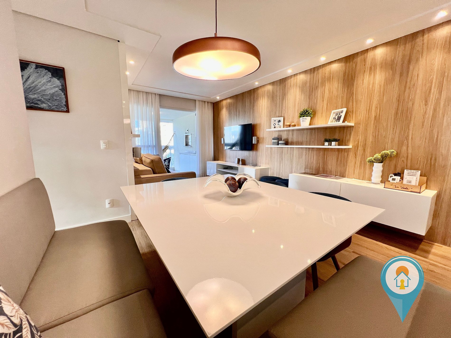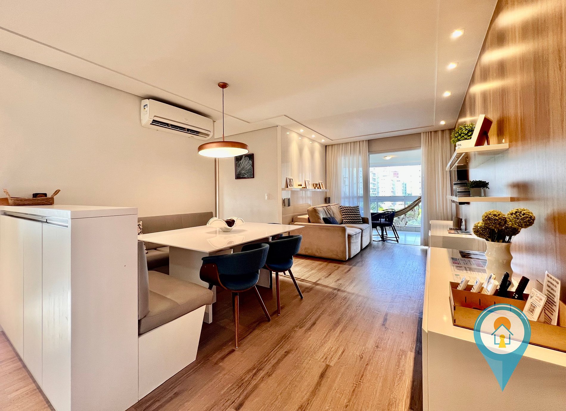 Na sala temos Ar condicionado, SmartTV 50”, BTV, Confortável Sofá e mesa de jantar. Saindo da sala você tem acesso a uma excelente sacada com vista para piscina, churrasqueira e tela de proteção para segurança das crianças.