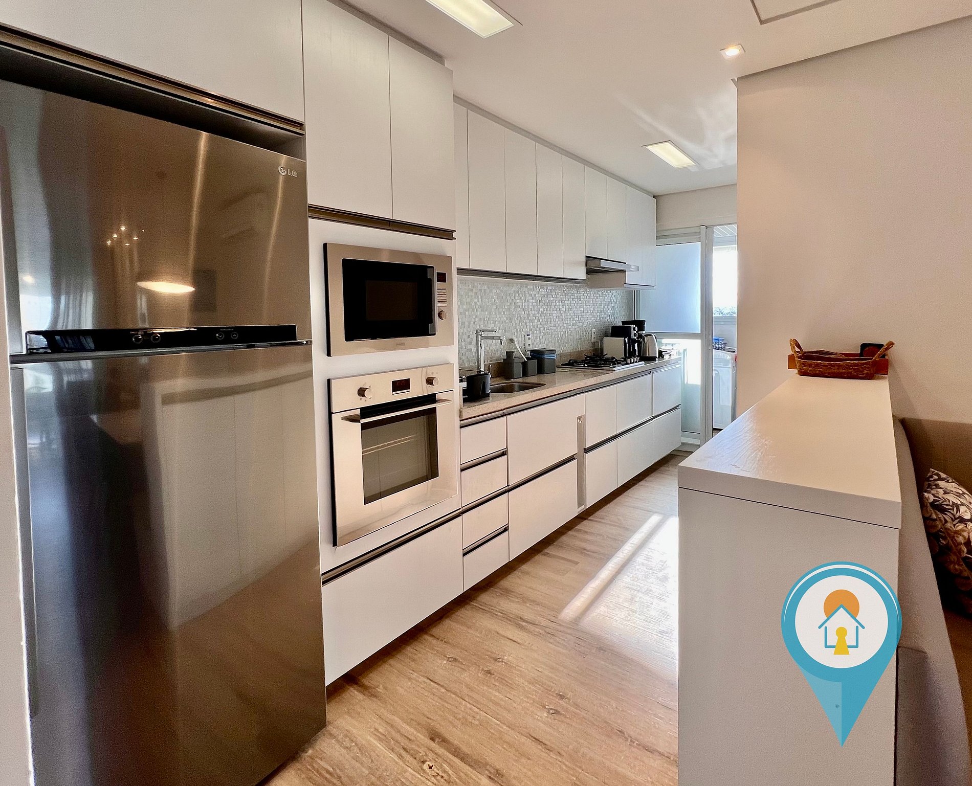 - Cozinha completa com utensílios, geladeira, fogão e pequenos eletros.