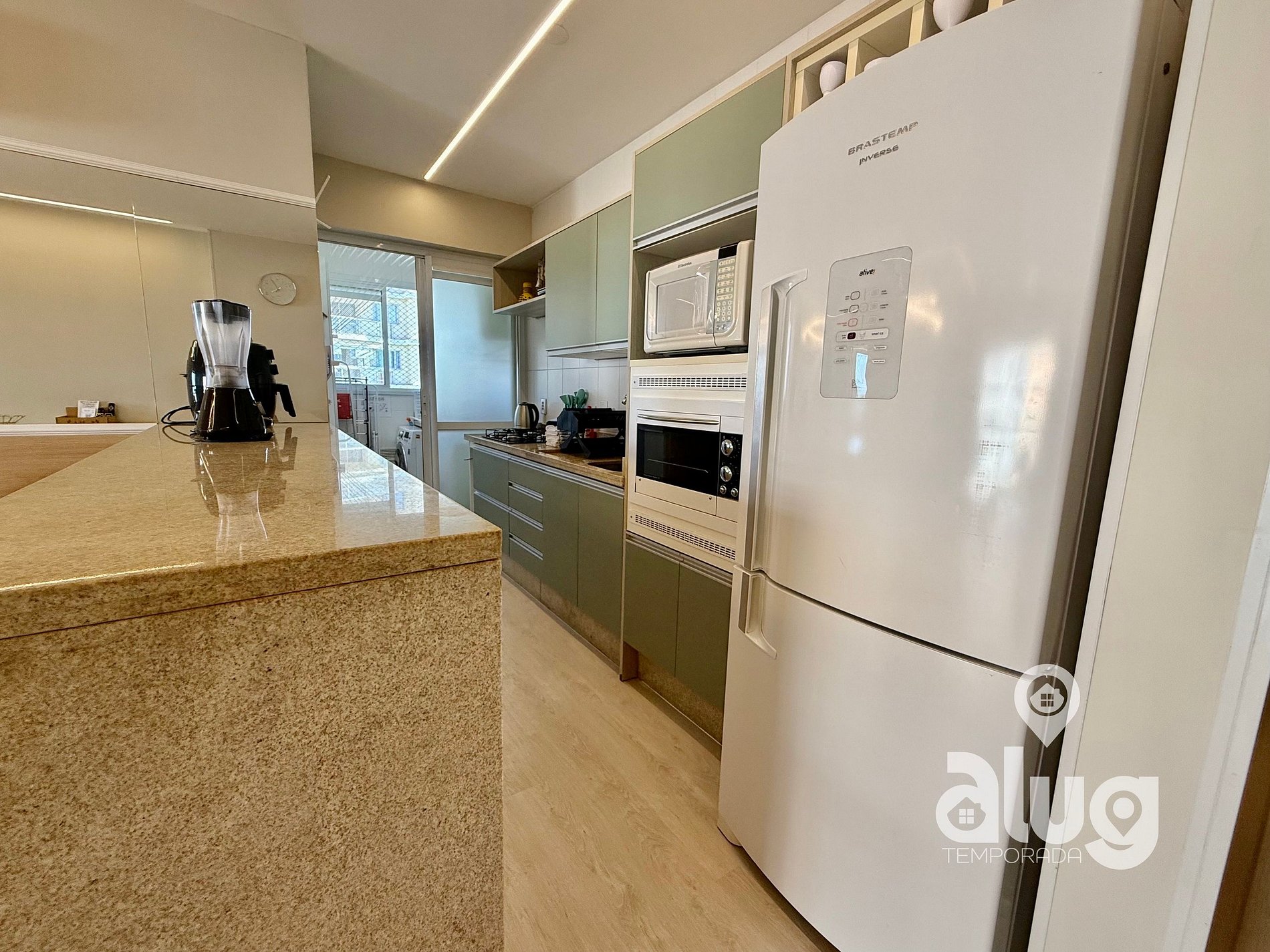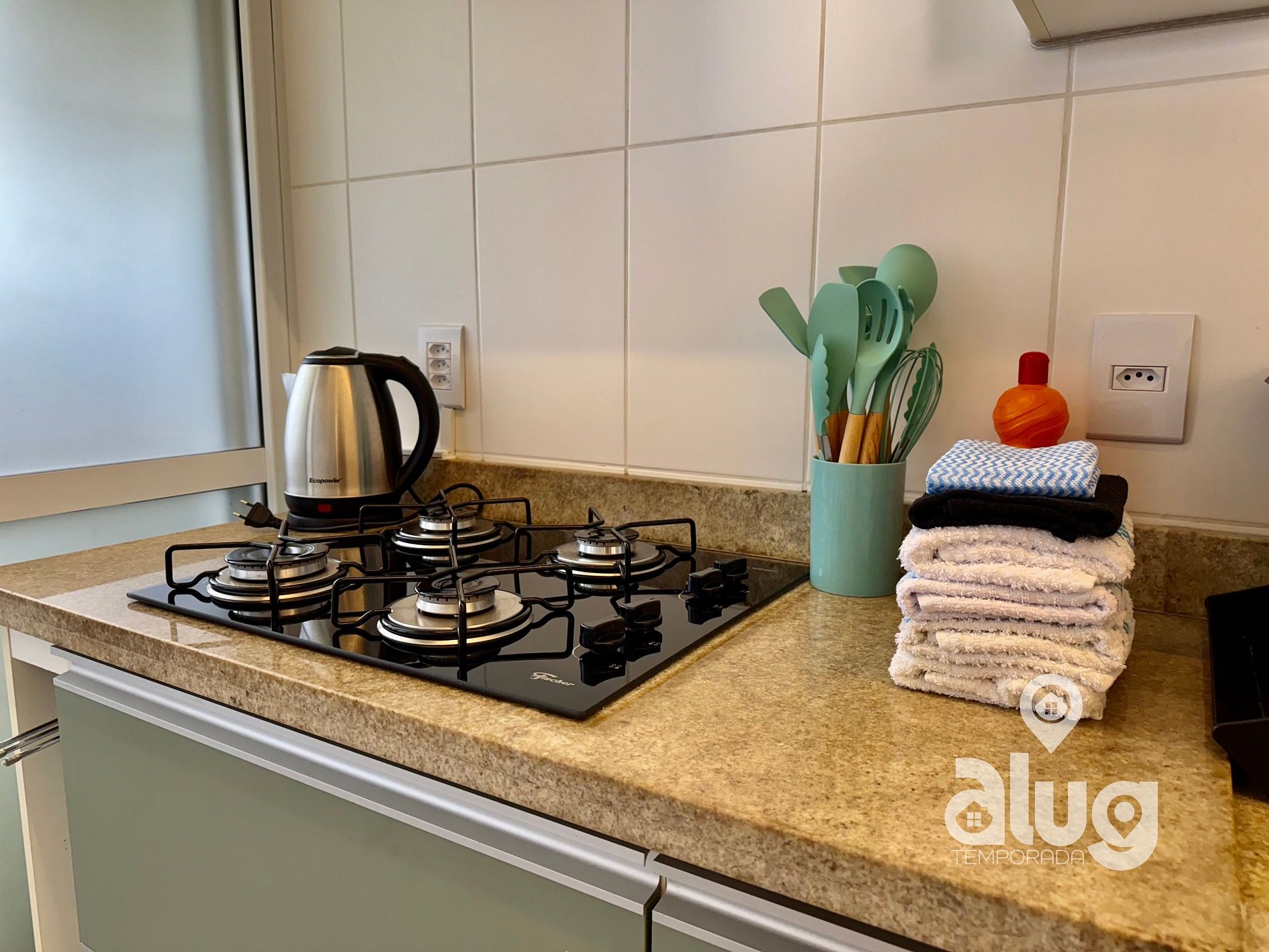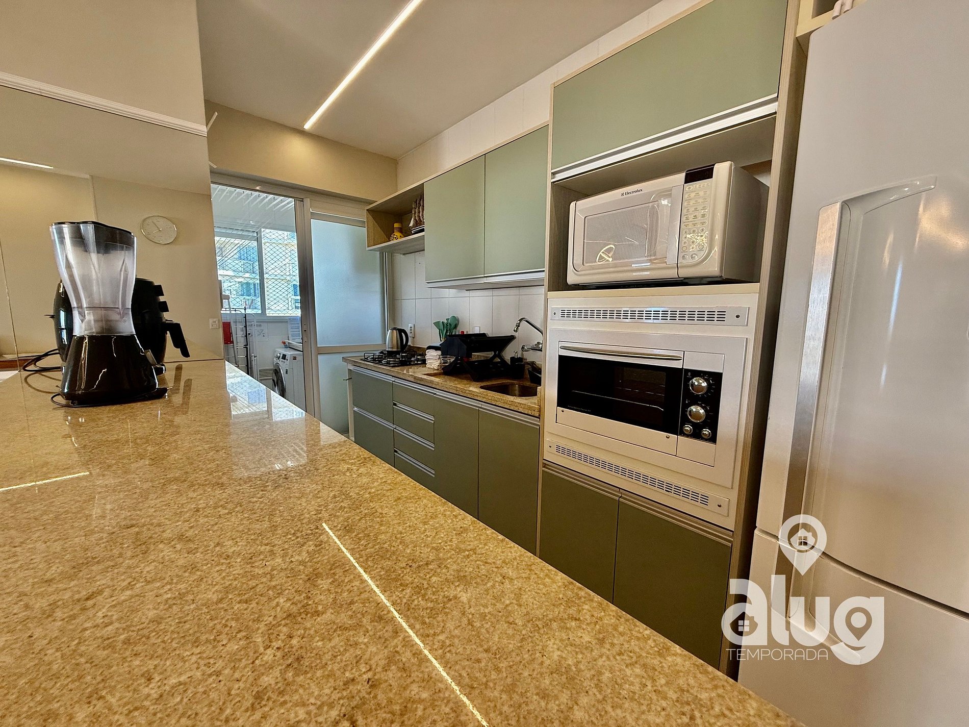 - Cozinha completa com utensílios, geladeira, fogão e pequenos eletros.