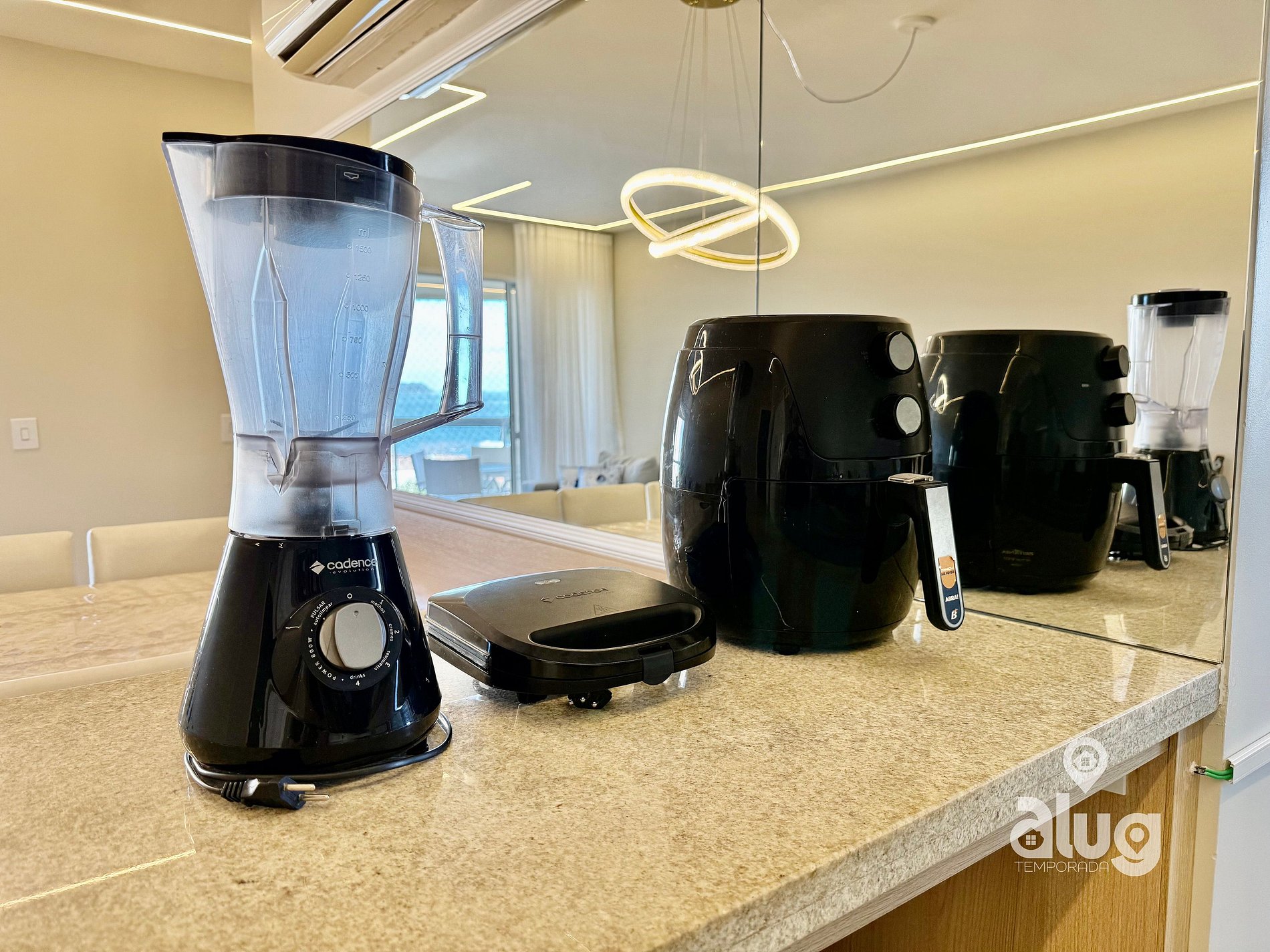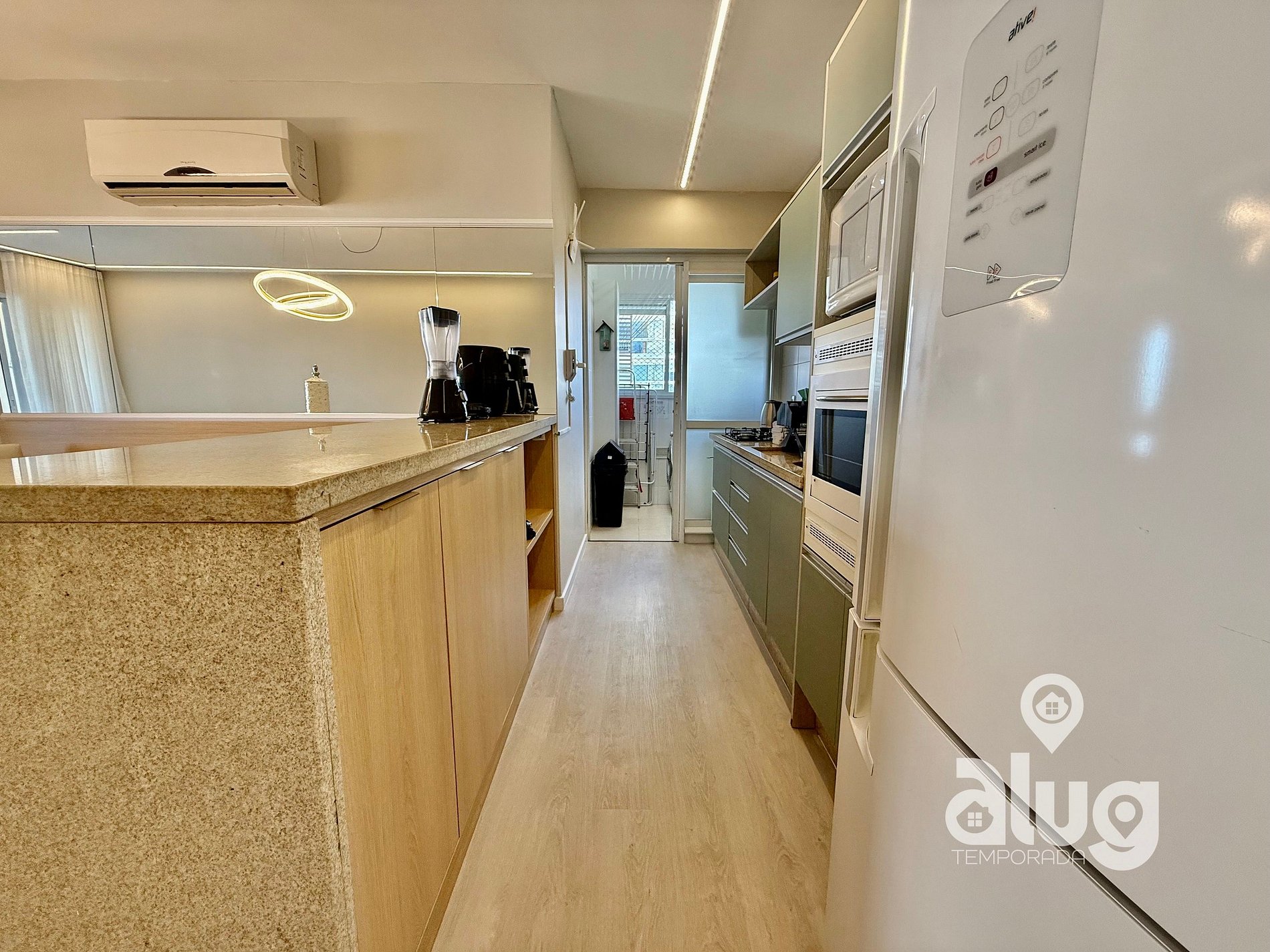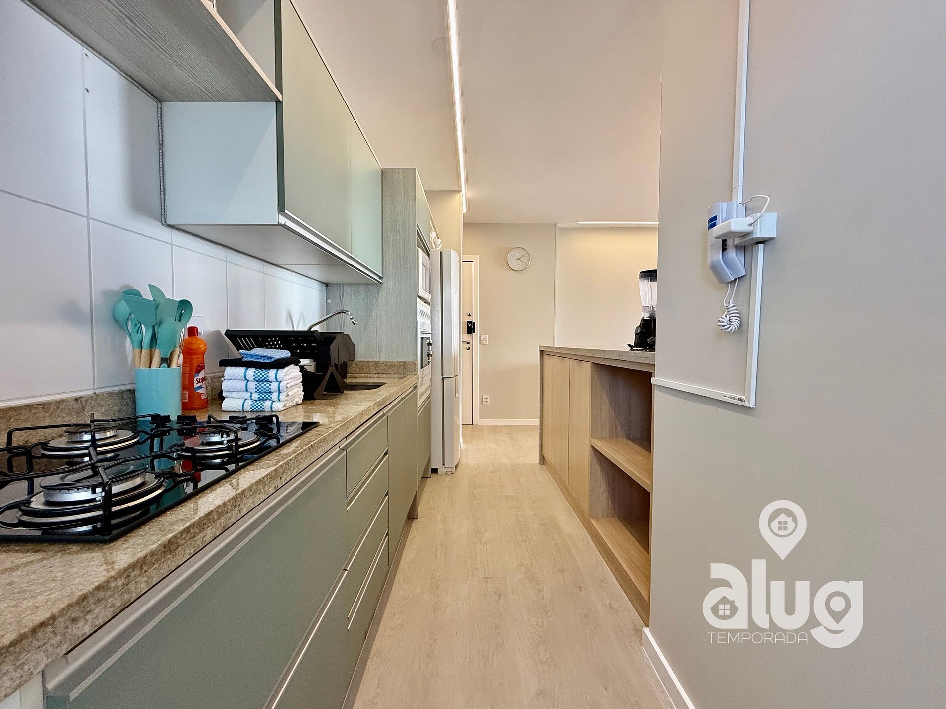 - Cozinha completa com utensílios, geladeira, fogão e pequenos eletros.