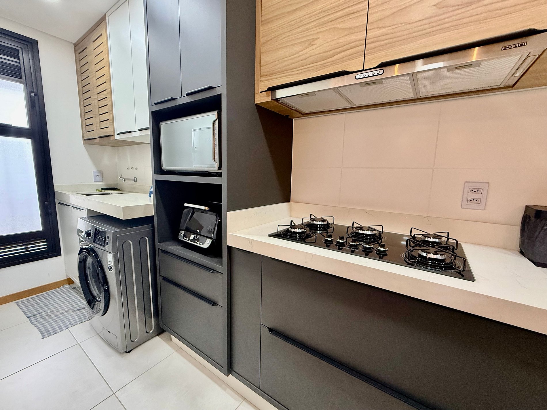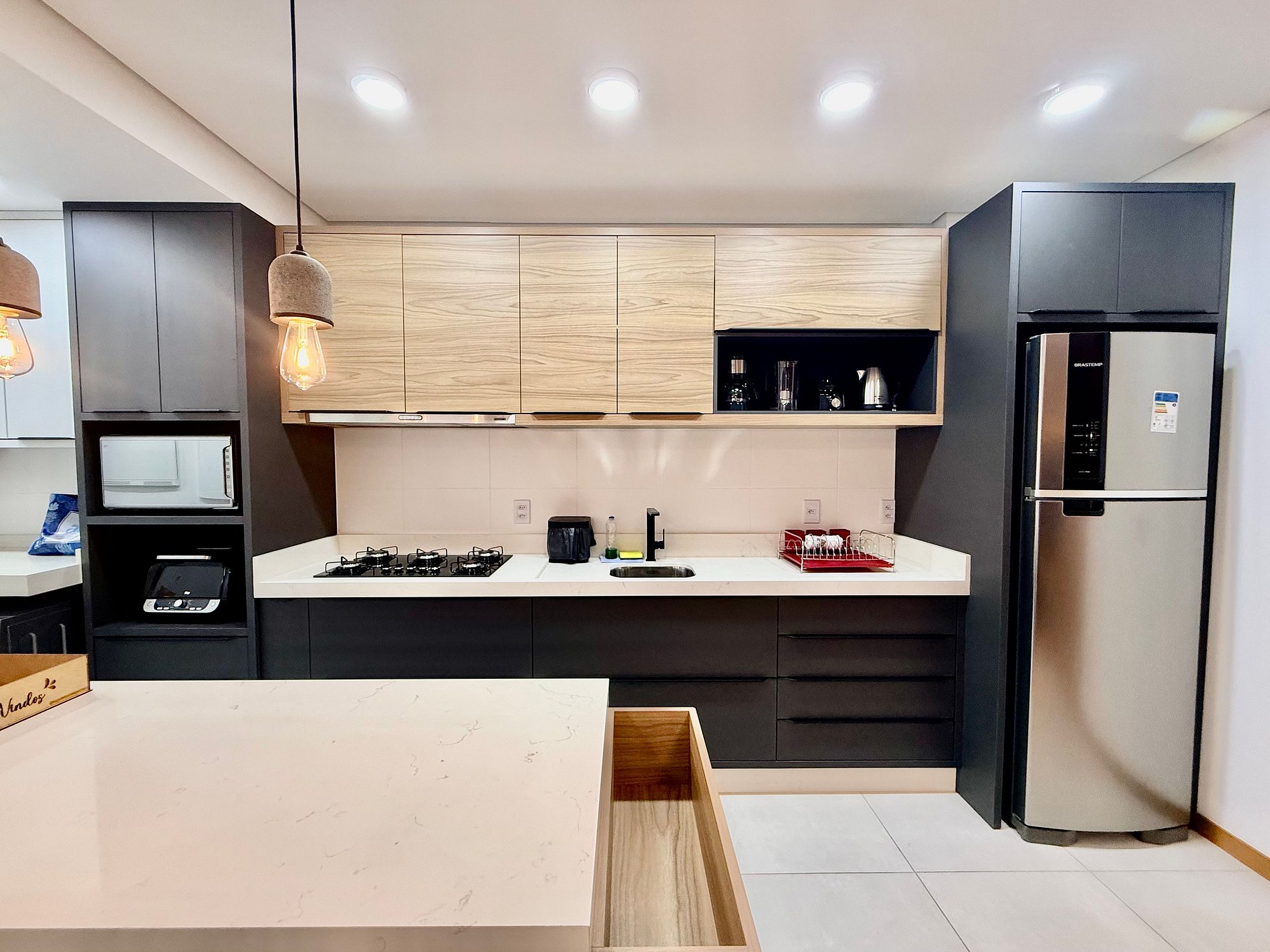 • Cozinha completa com utensílios, panelas, pratos, copos e eletrodomésticos