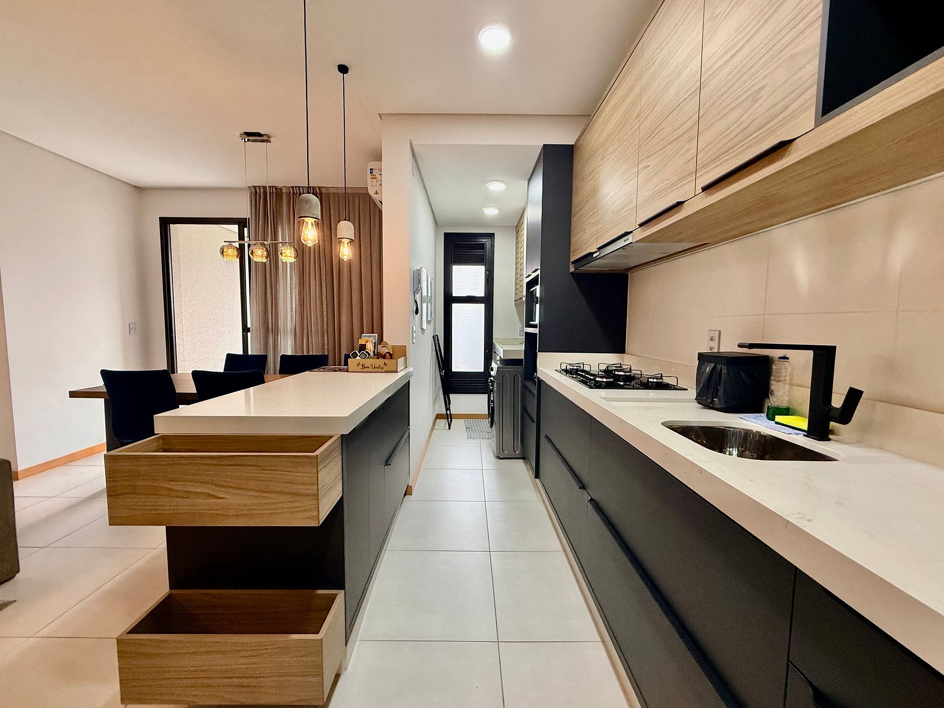 A área social é integrada e bem iluminada, com sala confortável e sacada gourmet com churrasqueira, perfeita para momentos de lazer. A cozinha é funcional e equipada para preparar refeições do dia a dia.