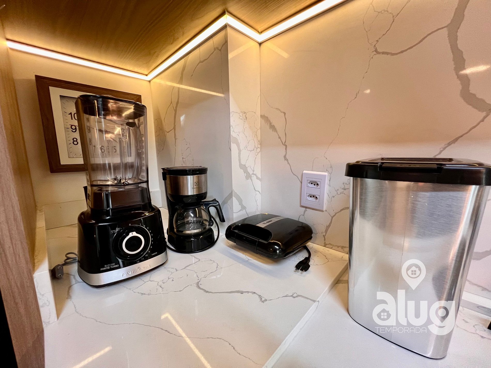 Cozinha completa com utensílios, geladeira, fogão e pequenos eletros.