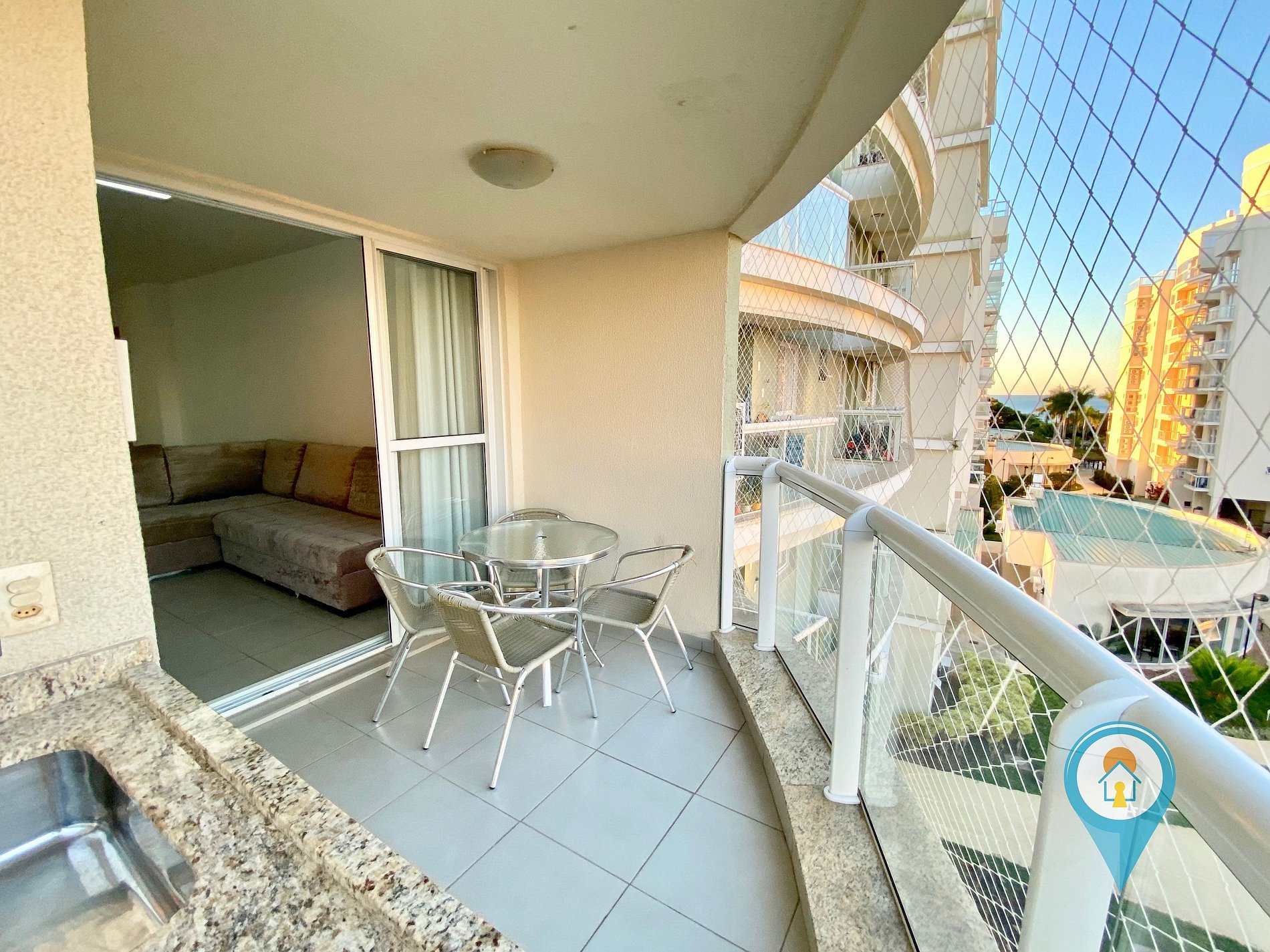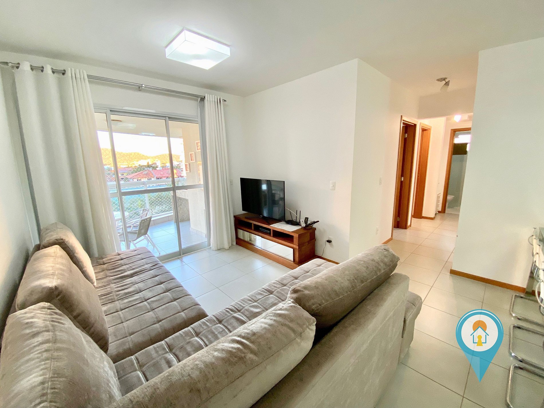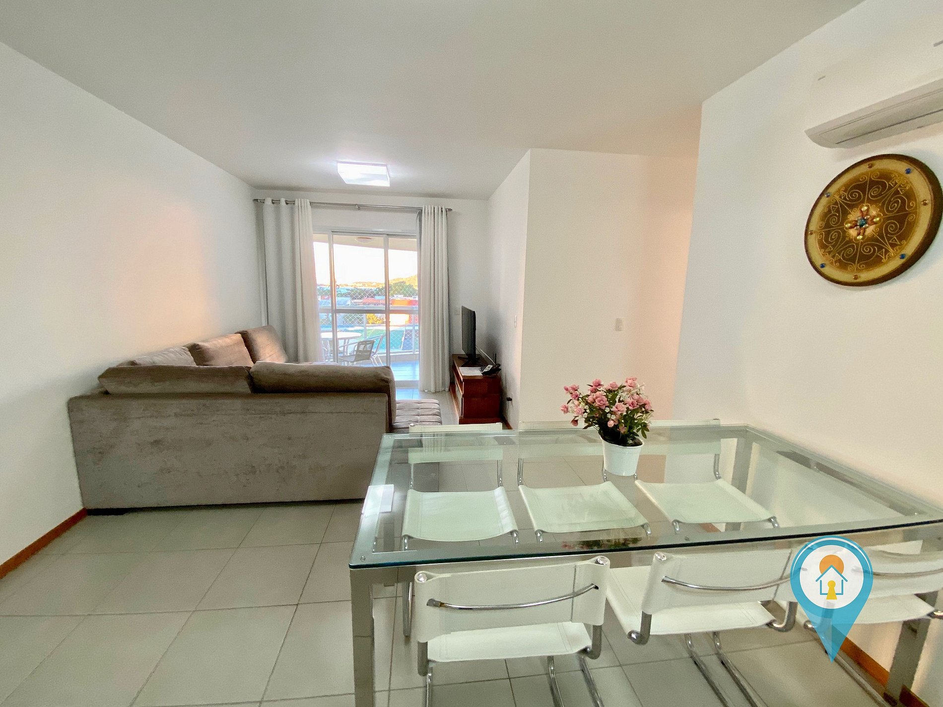 Na sala temos Ar condicionado, TV 43” e TV a cabo (Sky), Confortável Sofá e mesa de jantar. Saindo da sala você tem acesso a uma excelente sacada com churrasqueira e tela de proteção para segurança das crianças.