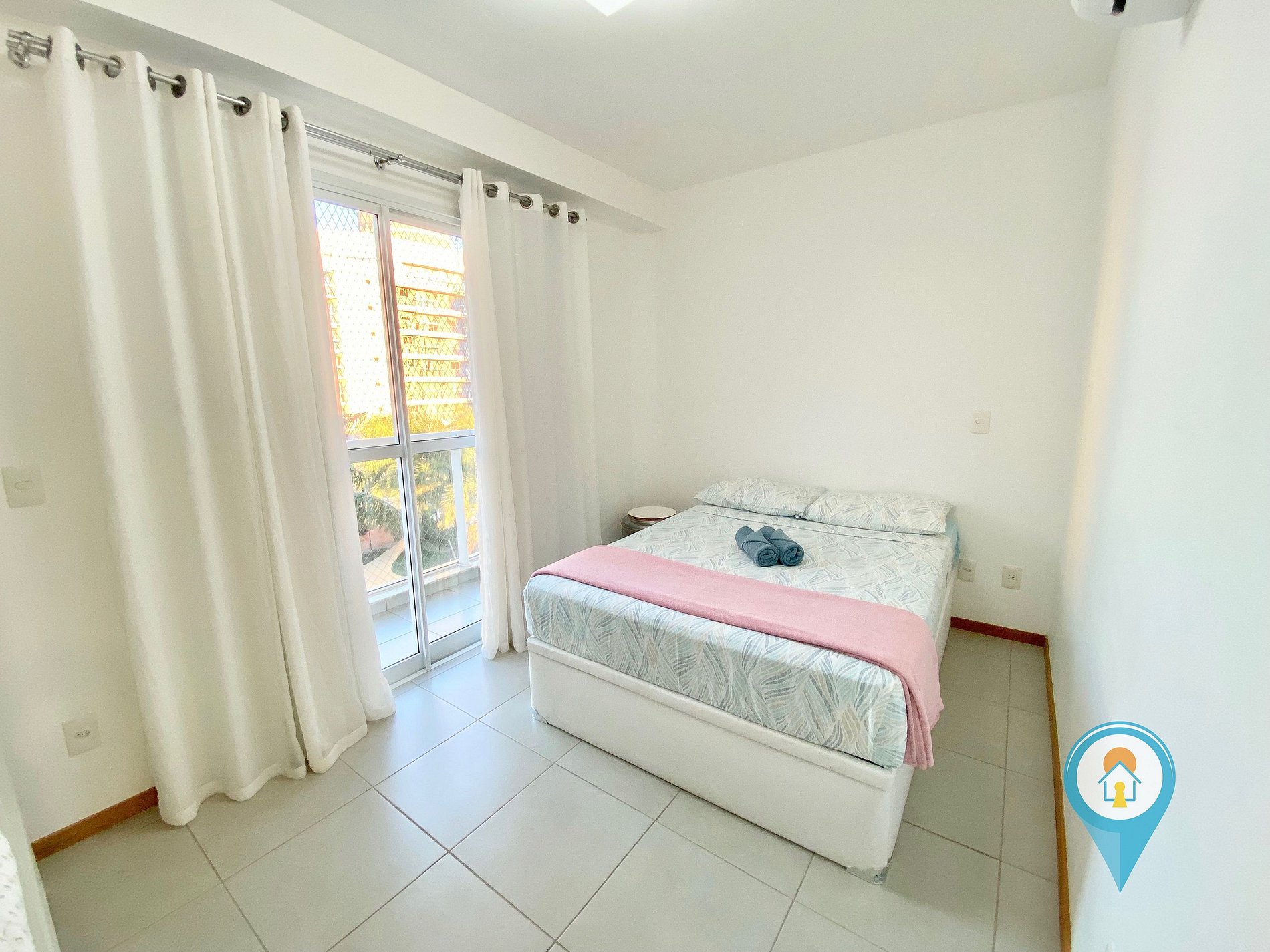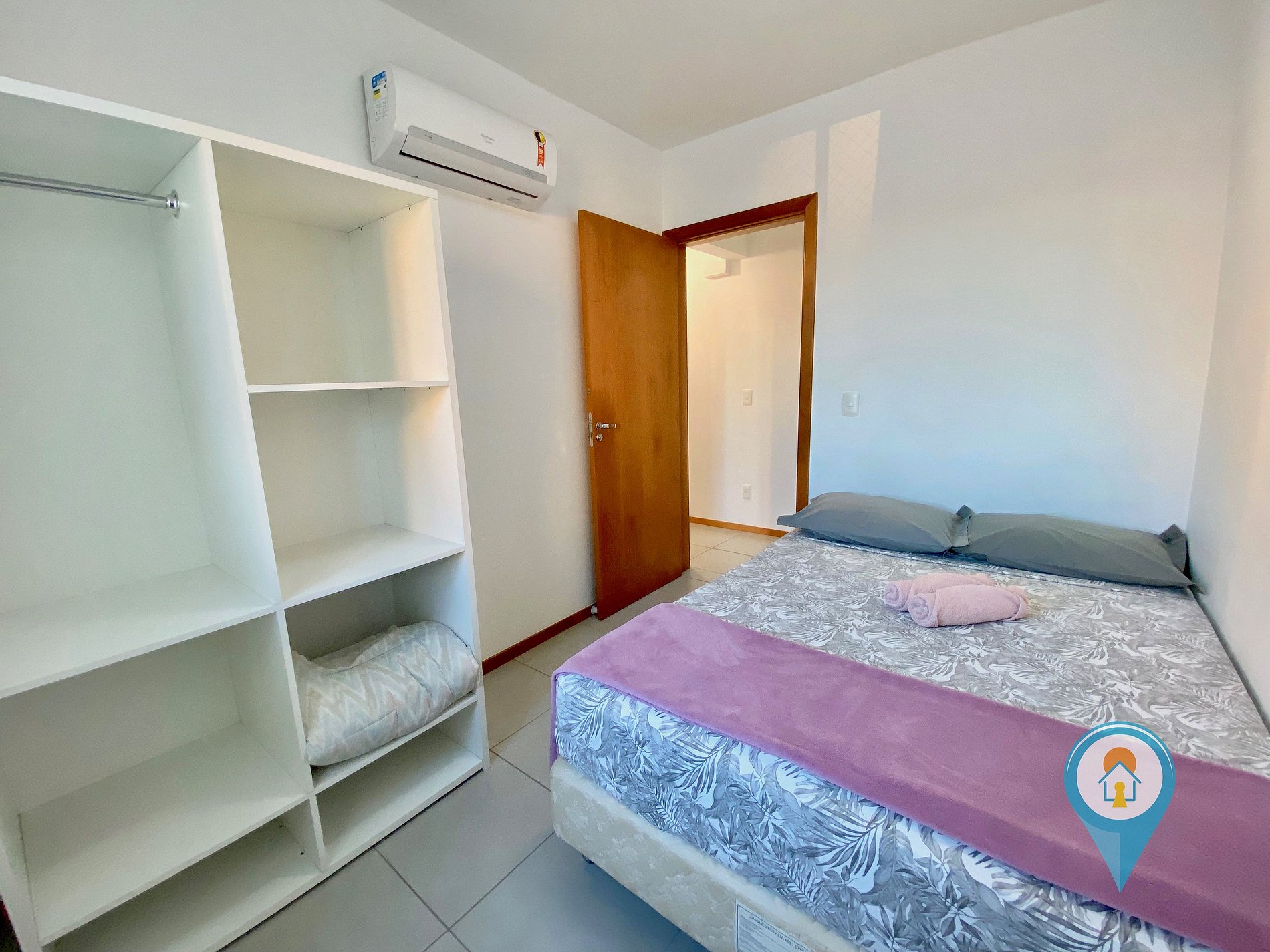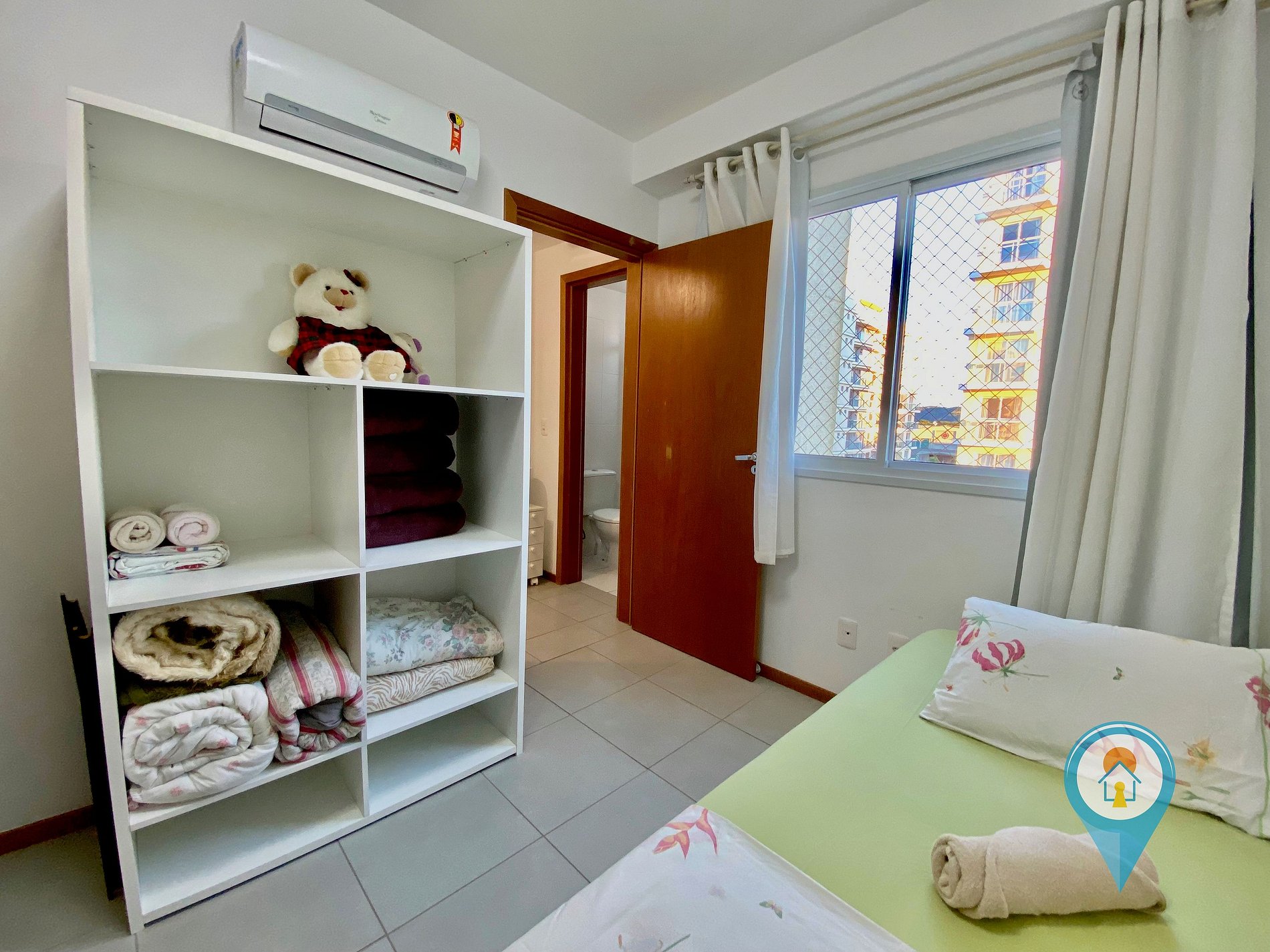 Suíte: Equipada com Ar condicionado, Cama de casal, sacada com tela de proteção e móveis.