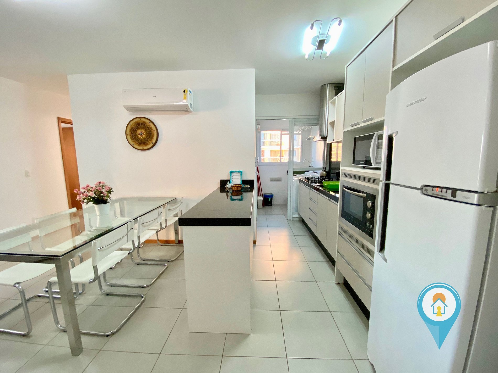 - Cozinha completa com utensílios, geladeira, fogão e pequenos eletros.