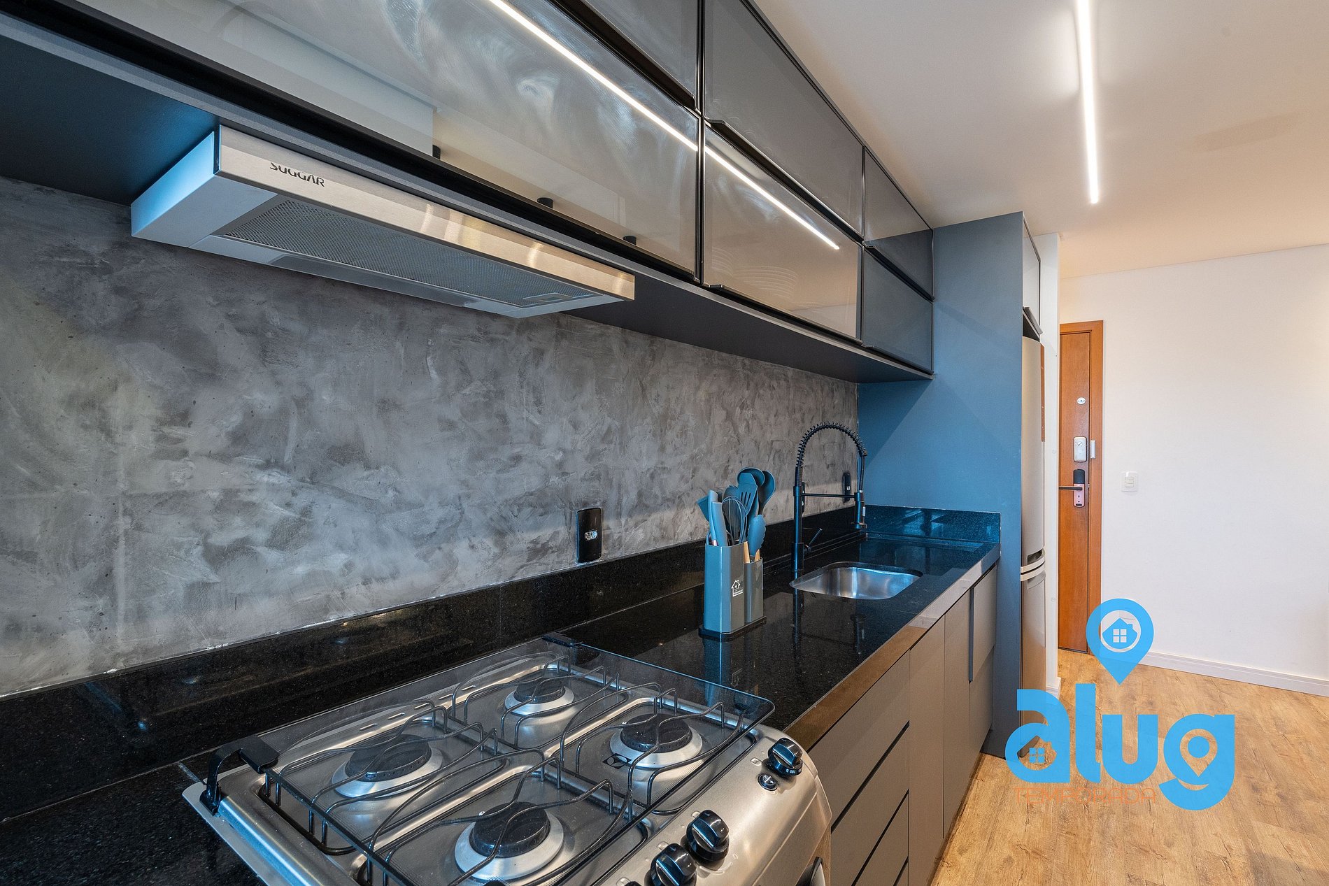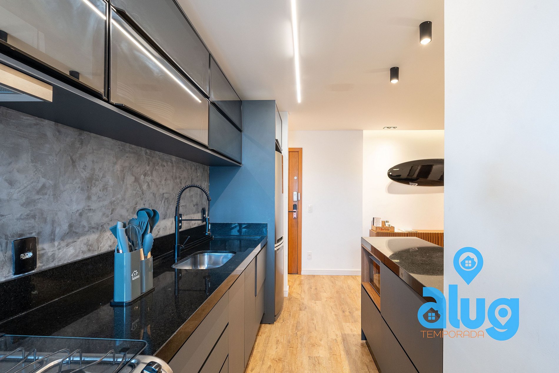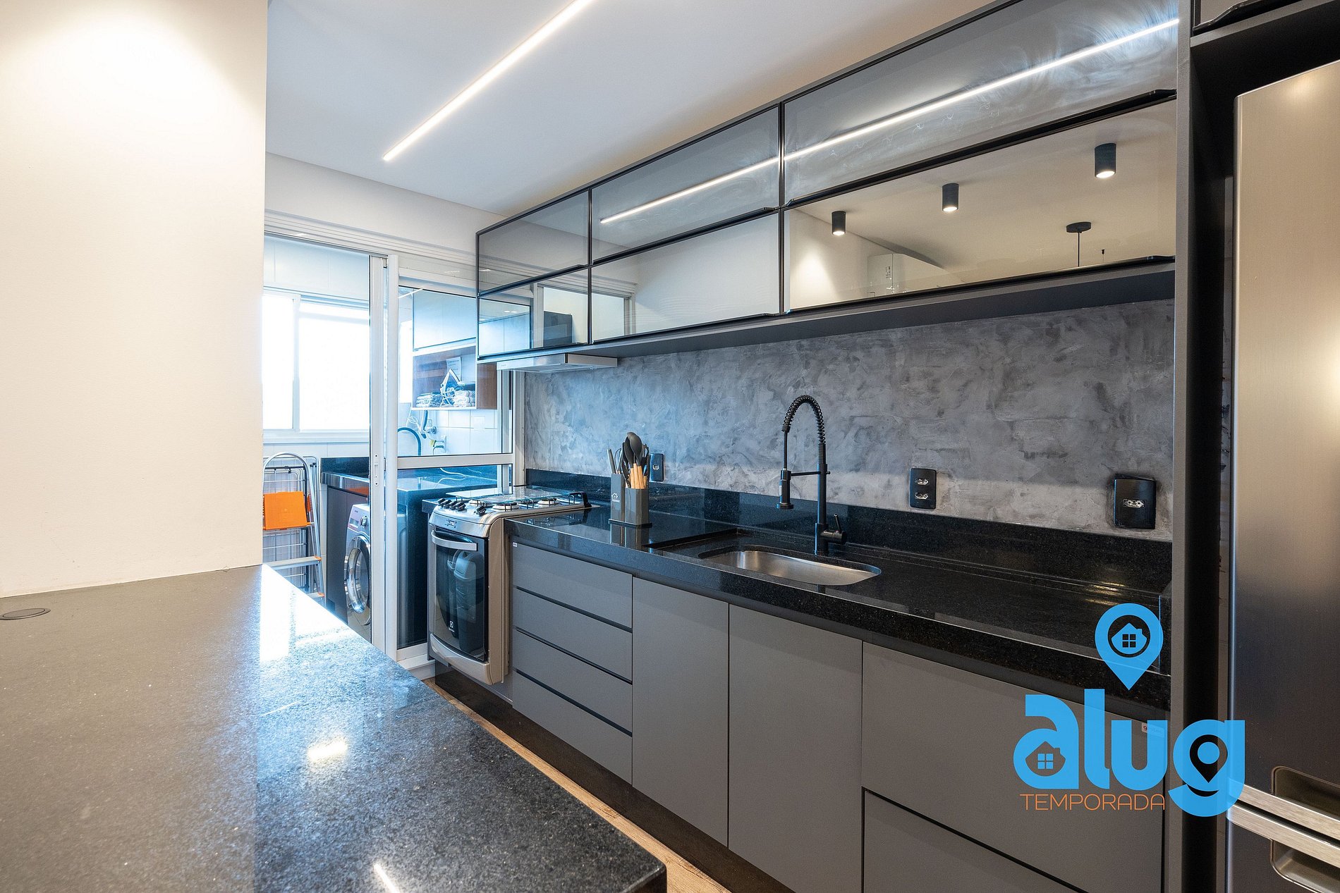 - Cozinha completa com utensílios, geladeira, fogão e pequenos eletros.