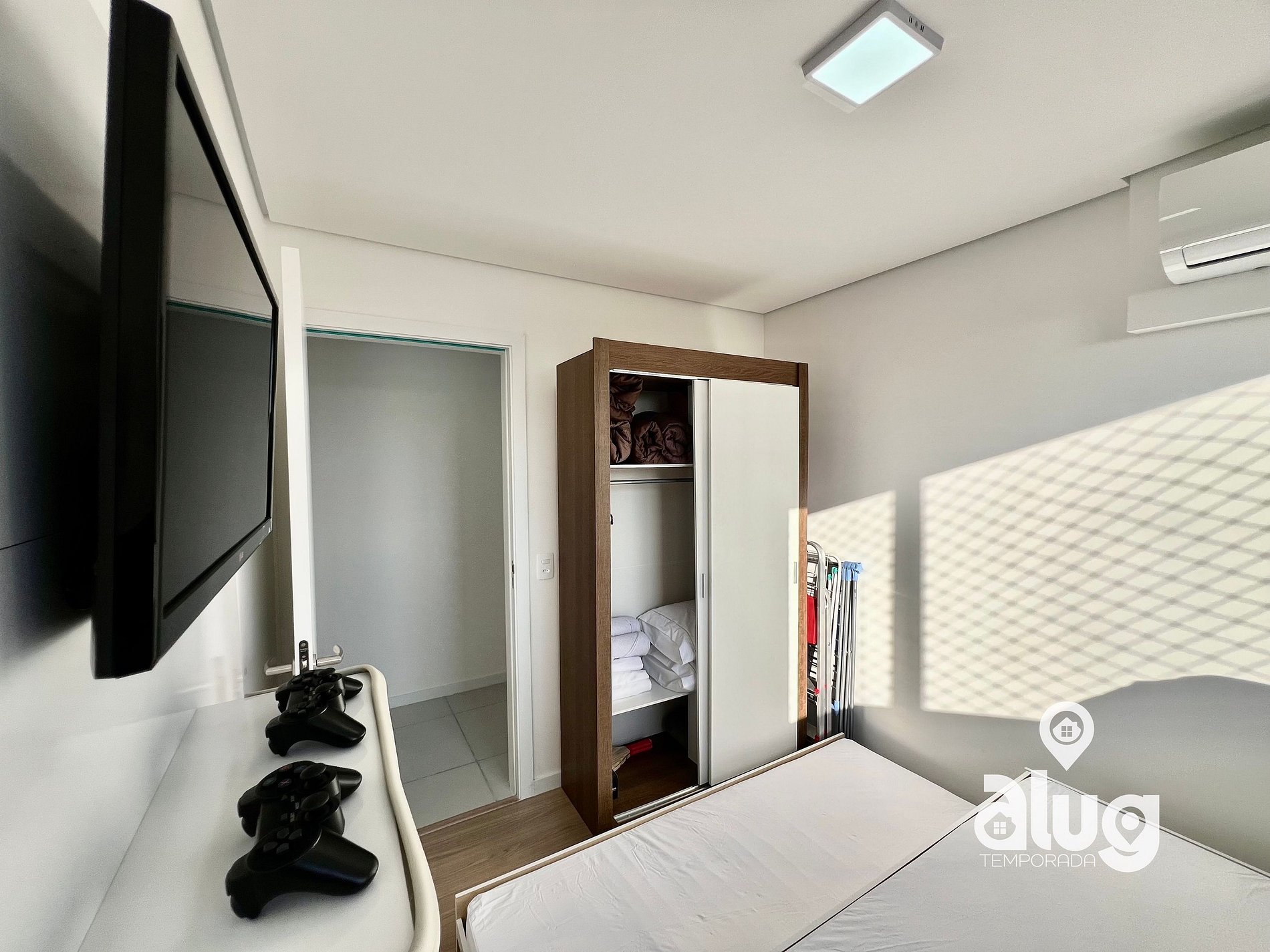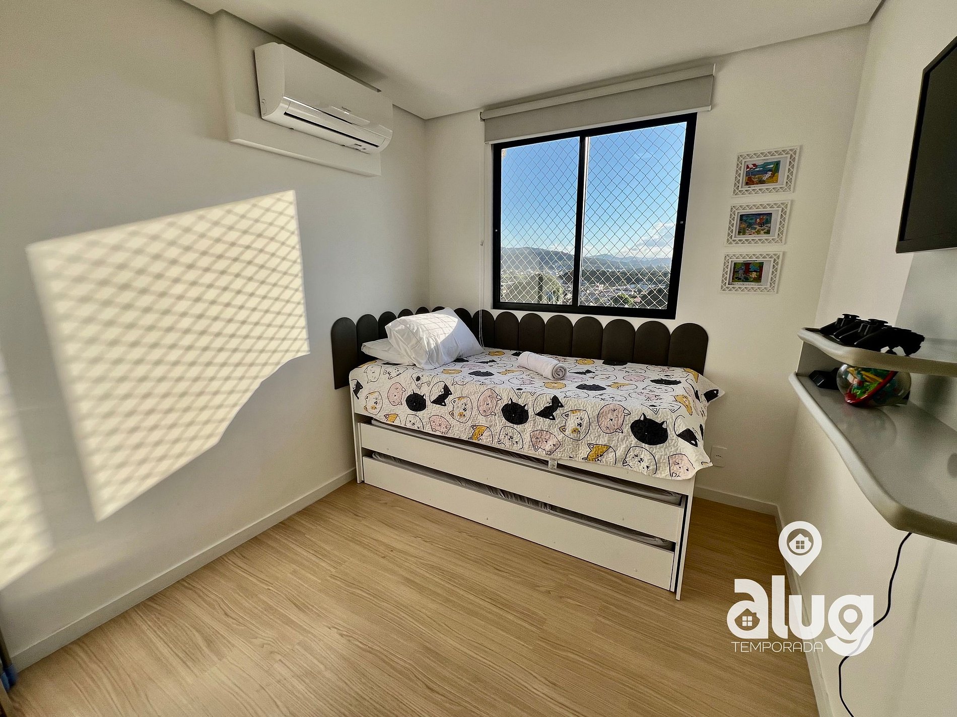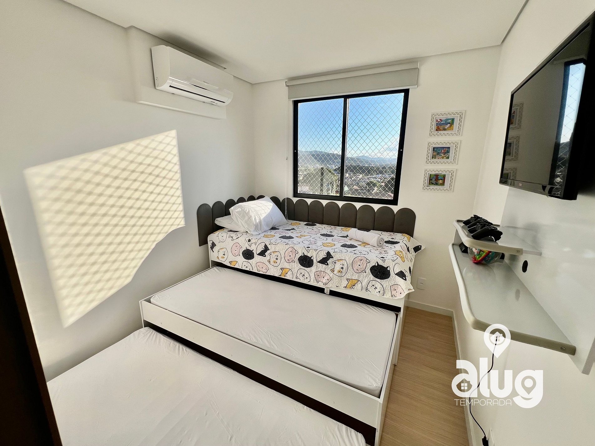• Quarto de solteiro com 3 camas, videogame e Smart TV, ideal para as crianças;