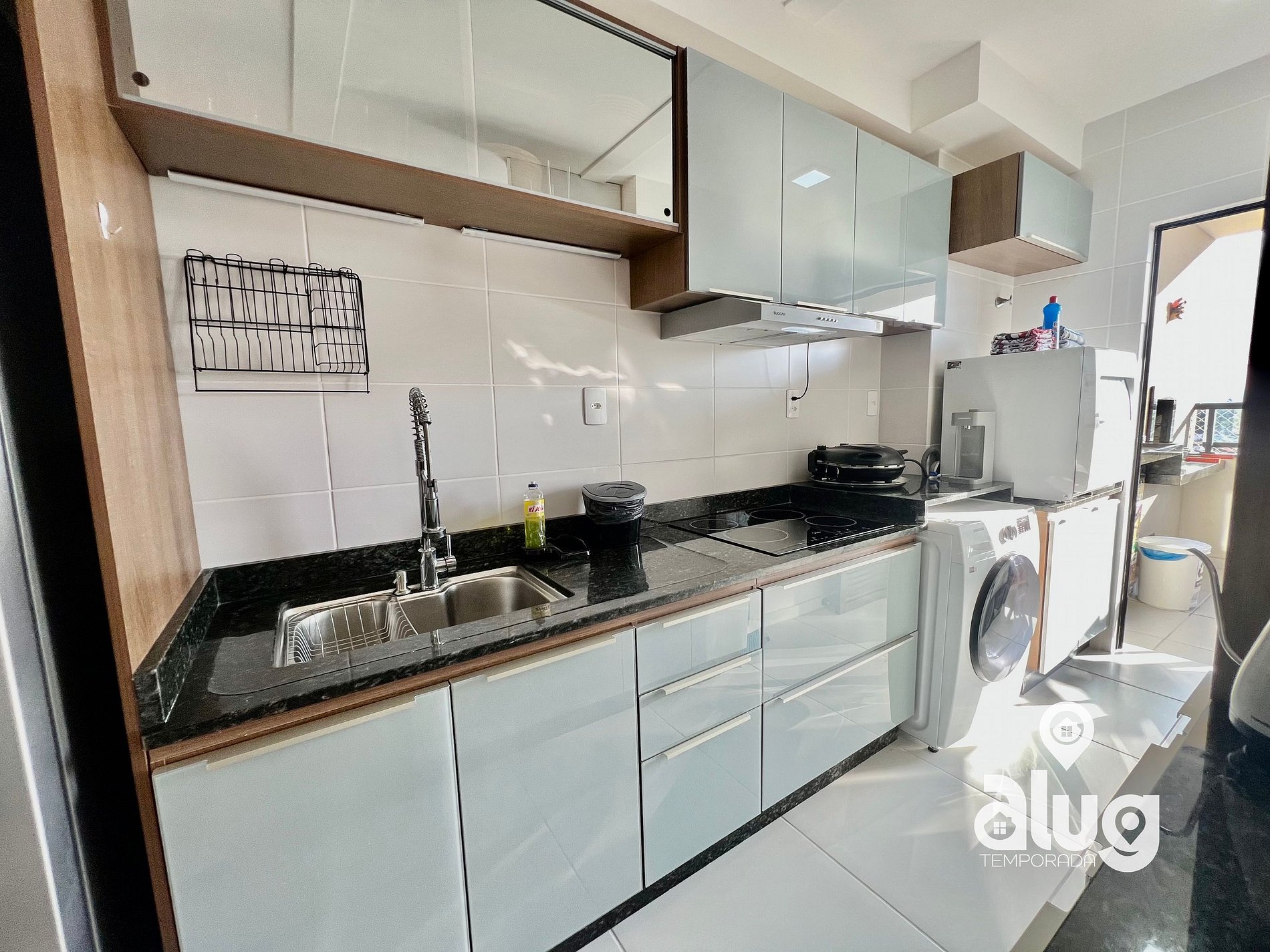 A cozinha é totalmente equipada, com lava-louças, utensílios diversos, micro-ondas, forno, geladeira e todos os eletrodomésticos necessários para preparar refeições com praticidade.
